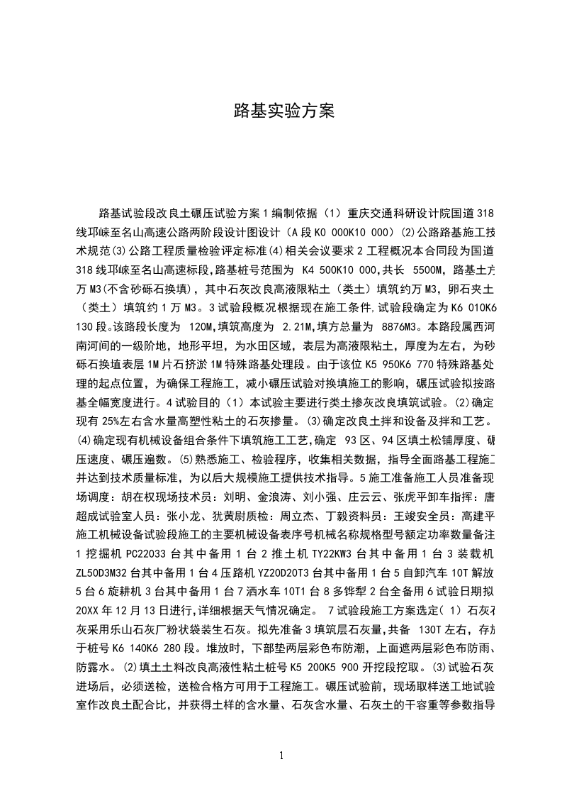 (4)相关会议要求2工程概况本合同段为国道318线邛崃至名山高速标段,路基桩号范围为K4 500K10 000,共长5500M,路基土方万M3(不含砂砾石换填),其中石灰改良高液限粘土(类土)填筑约万M3,卵石夹土(类土)填筑约1万M3。3试验段概况根据现在施工条件,试验段确定为K6 010K6 130段。该路段长度为120M,填筑高度为2.21M,填方总量为8876M3。本路段属西河南河间的一级阶地,地形平坦,为水田区域,表层为高液限粘土,厚度为左右,为砂砾石换埴表层1M片石挤淤1M特殊路基处理段。由于该位K5 950K6 770特殊路基处理的起点位置,为确保工程施工,减小碾压试验对换填施工的影响,碾压试验拟按路基全幅宽度进行。4试验目的(1)本试验主要进行类土掺灰改良填筑试验。