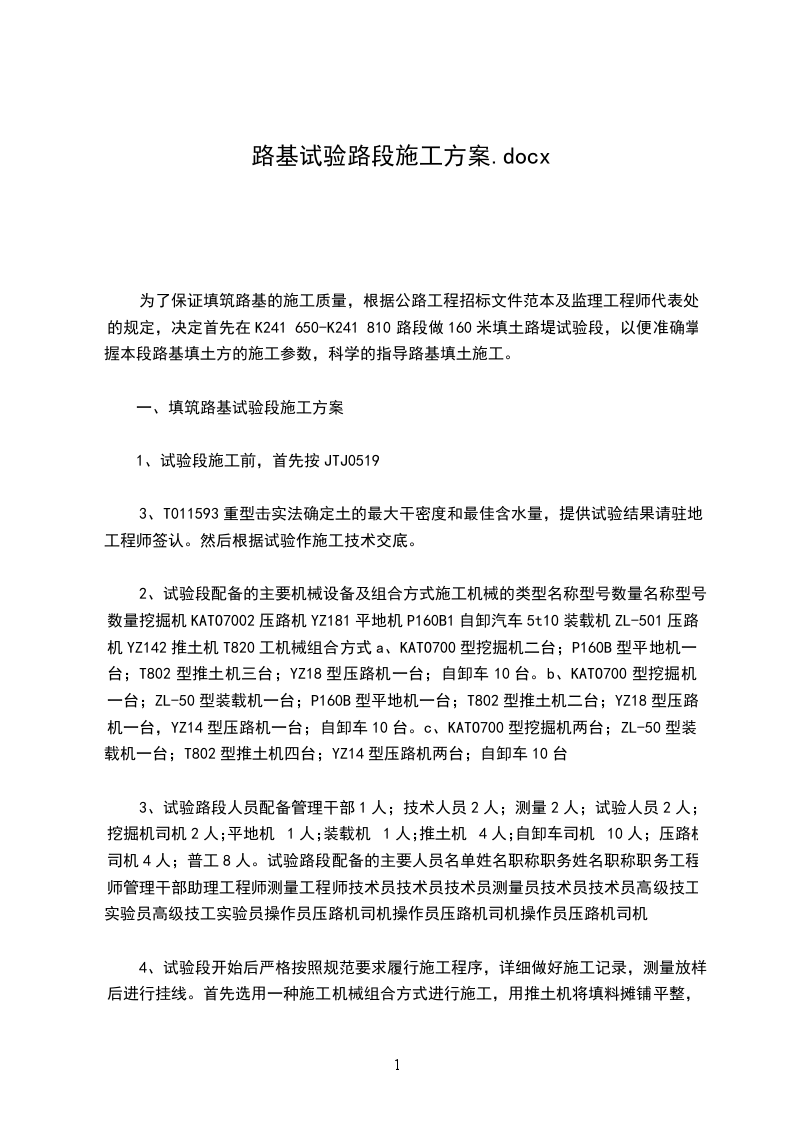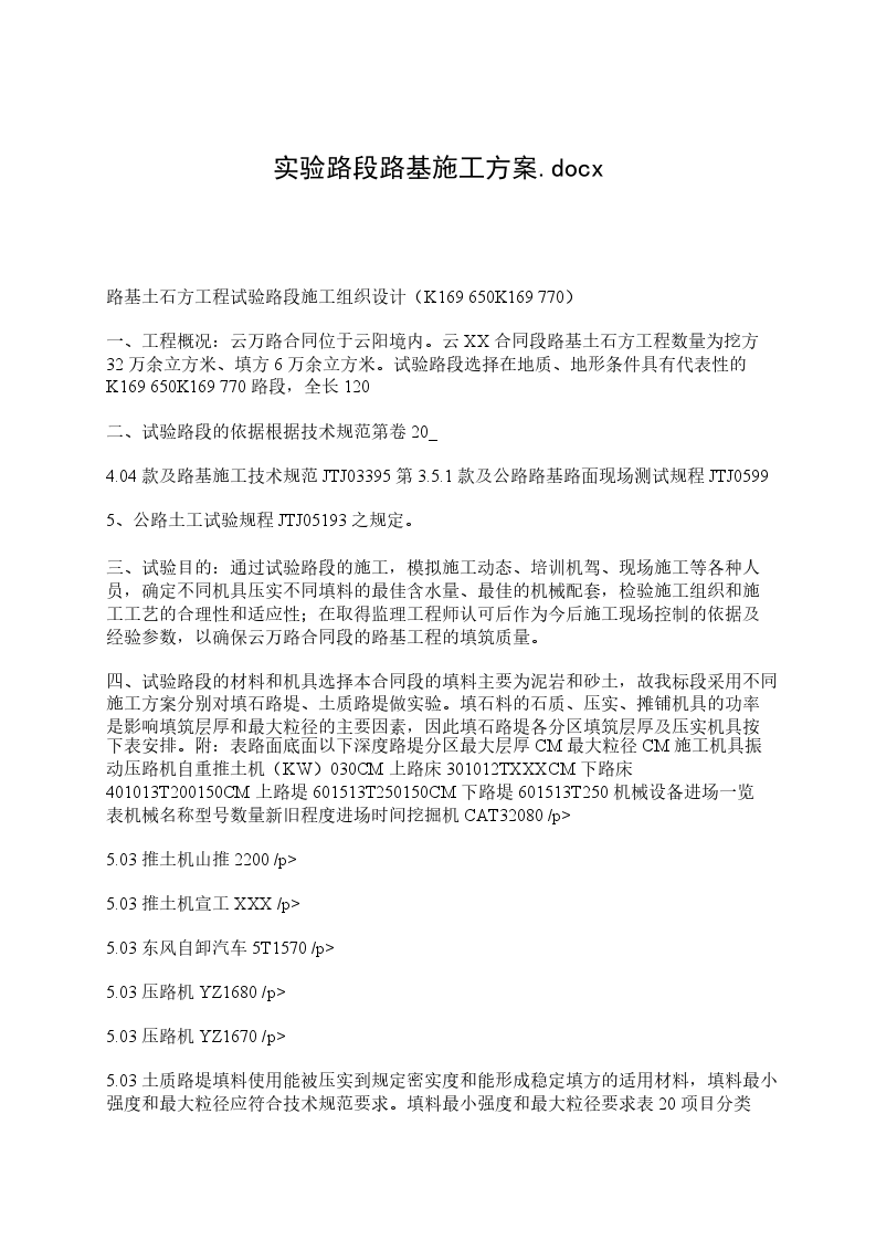 (5)熟悉施工、检验程序,收集相关数据,指导全面路基工程施工并达到技术质量标准,为以后大规模施工提供技术指导。5施工准备施工人员准备现场调度:胡在权现场技术员:刘明、金浪涛、刘小强、庄云云、张虎平卸车指挥:唐超成试验室人员:张小龙、犹黄尉质检:周立杰、丁毅资料员:王竣安全员:高建平施工机械设备试验段施工的主要机械设备表序号机械名称规格型号额定功率数量备注1挖掘机PC22033台其中备用1台2推土机TY22KW3台其中备用1台3装载机ZL50D3M32台其中备用1台4压路机YZ20D20T3台其中备用1台5自卸汽车10T解放5台6旋耕机3台其中备用1台7洒水车10T1台8多铧犁2台全备用6试验日期拟20XX年12月13日进行,详细根据天气情况确定。7试验段施工方案选定