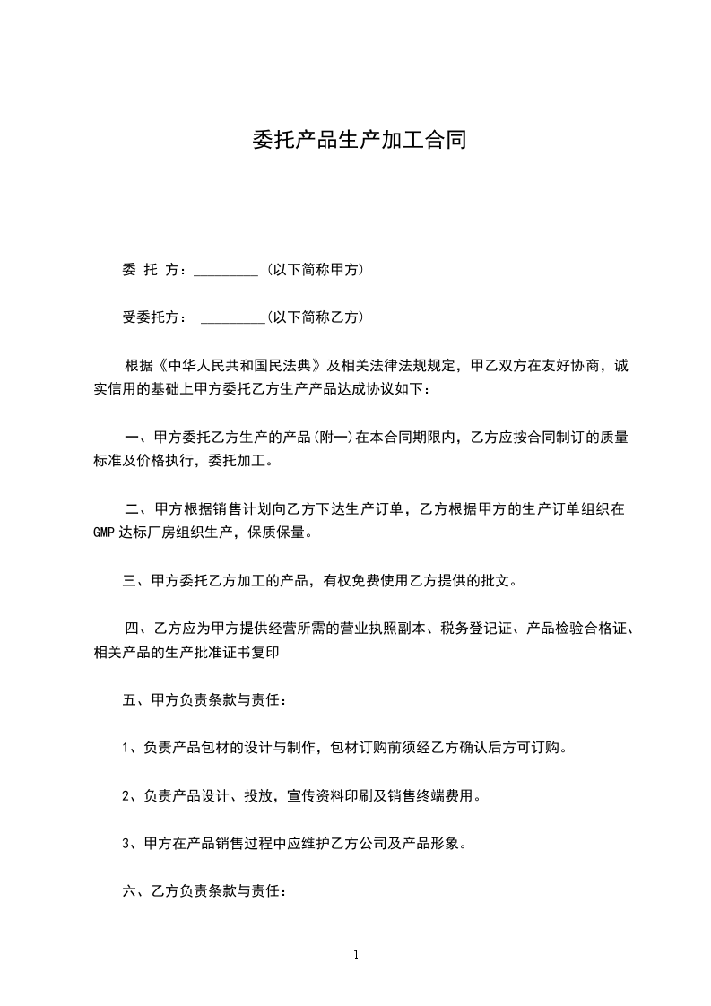 委托方与加工方在平等、自愿基础上,经友好协商签订此协议,以资共同遵守:委托方希望根据下列条件委托加工方___________产品,有关产品订单将按本协议规定向加工方发出。加工方希望根据下列条件为委托方加工___________产品,有关产品将按本协议规定完成。委托方为____________产品之唯一商标持有人及享有有关产品专利权。