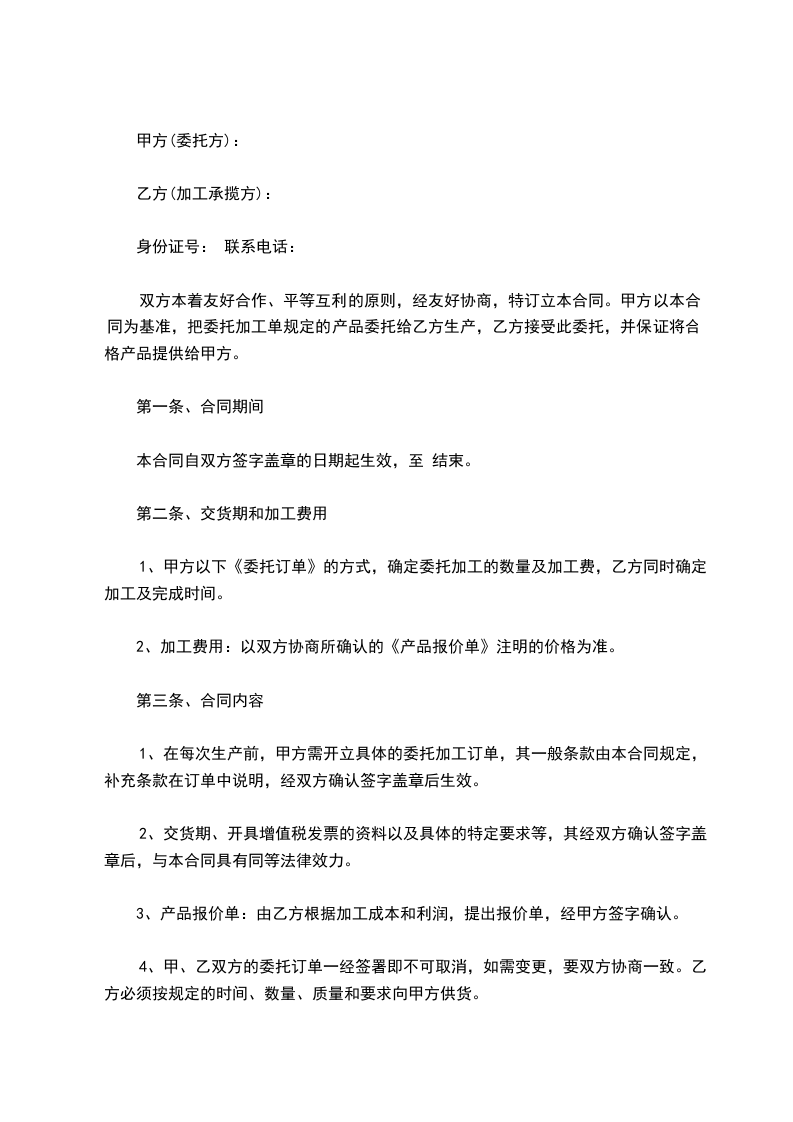 7、含增值税的加工费为人民币___________。于此协议签订日起计至_________年____月____日,可以双方同意下,根据情况作出调整。