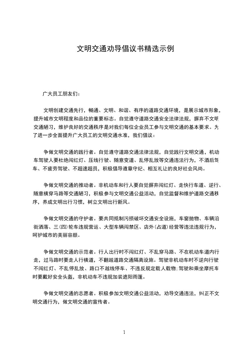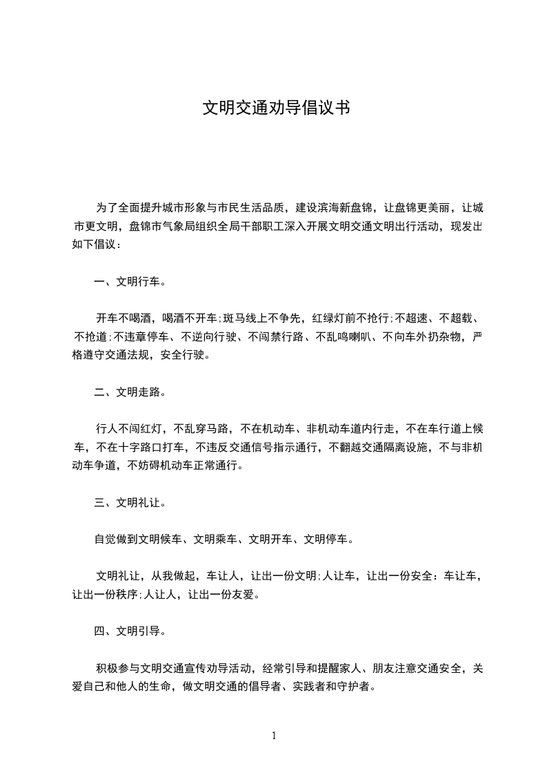 一、做一个文明交通的参与者。认真学习宣传和自觉遵守道路交通安全法,增强文明交通意识。积极开展车让车、车让人、人让车、人让人的四让活动,不闯红灯、不乱穿马路、谅解宽容、文明礼让;行动。