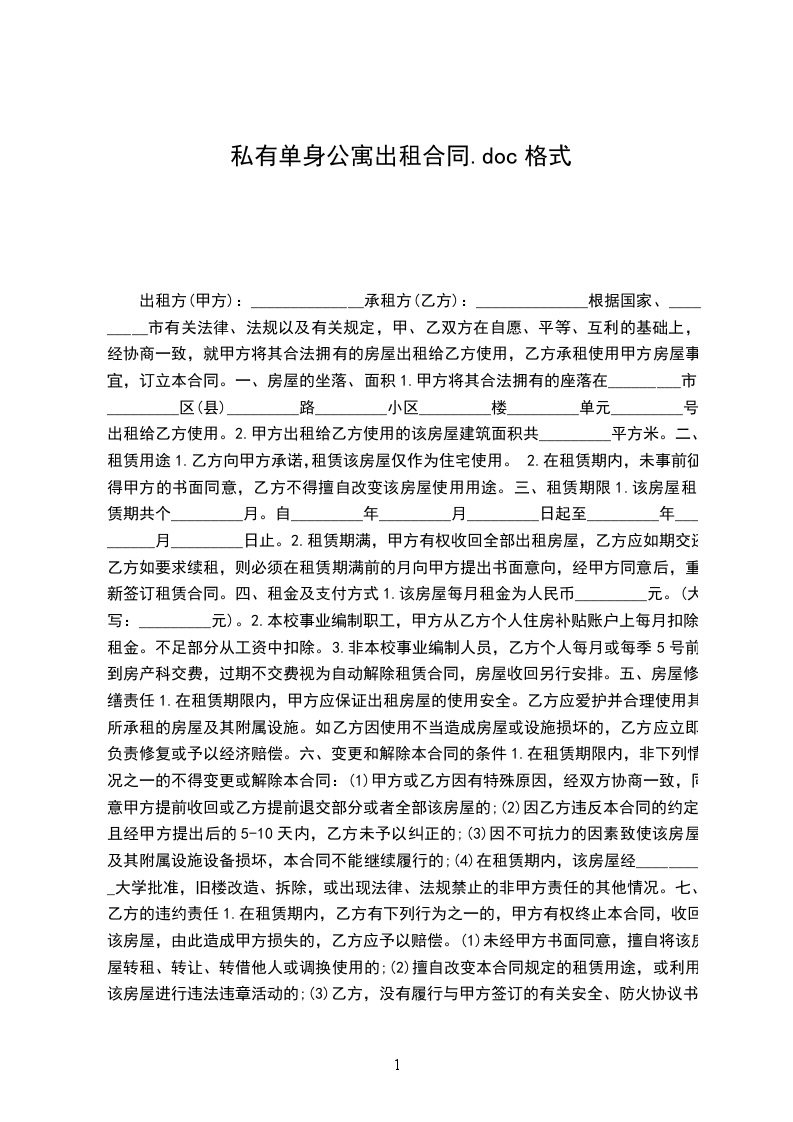 1.甲方将其合法拥有的座落在_________市_________区(县)_________路_________小区_________楼_________单元_________号出租给乙方使用。