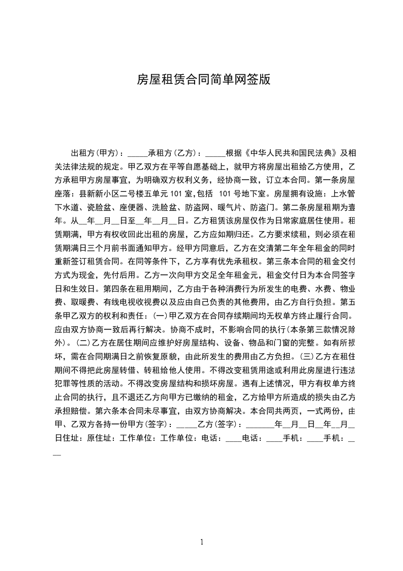 第一条房屋座落:县新新小区二号楼五单元101室,包括101号地下室。