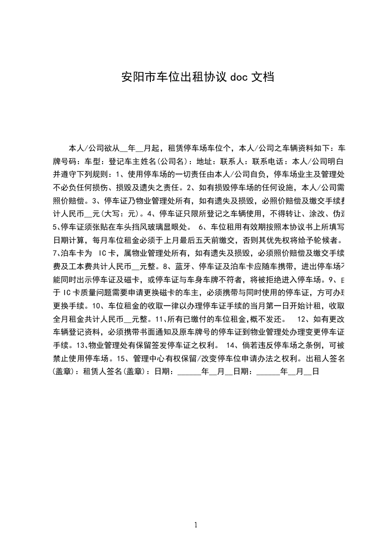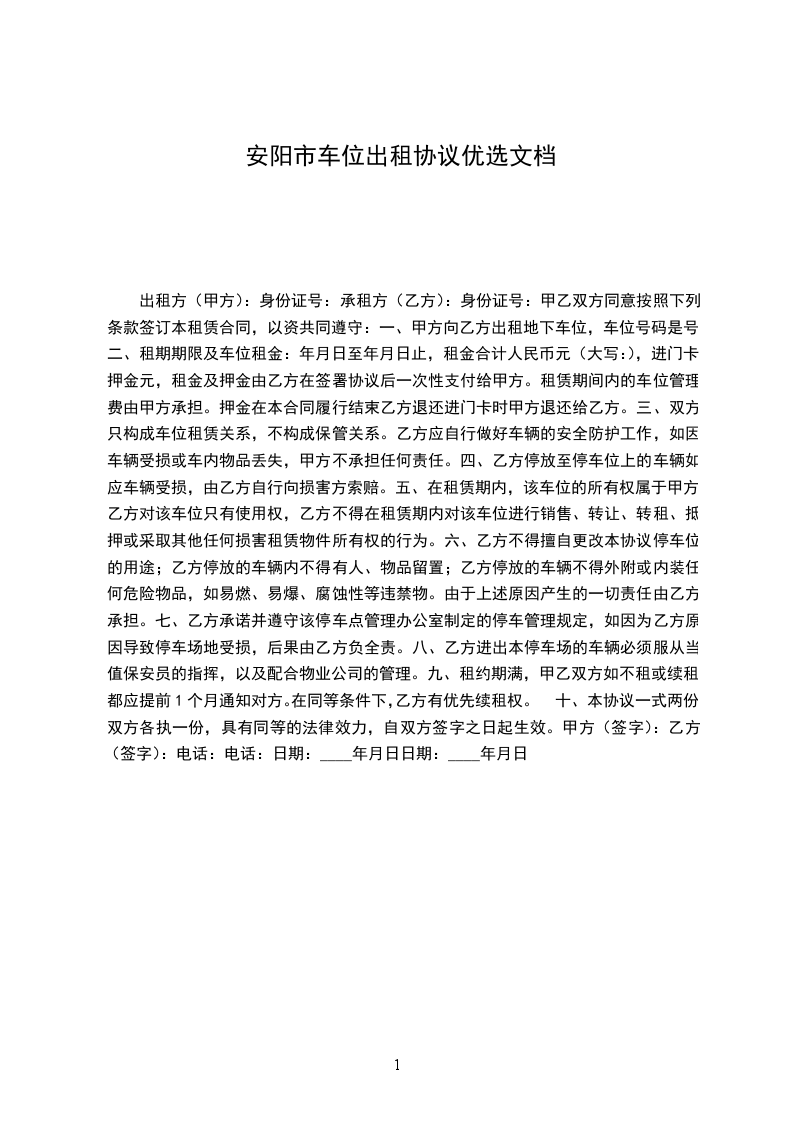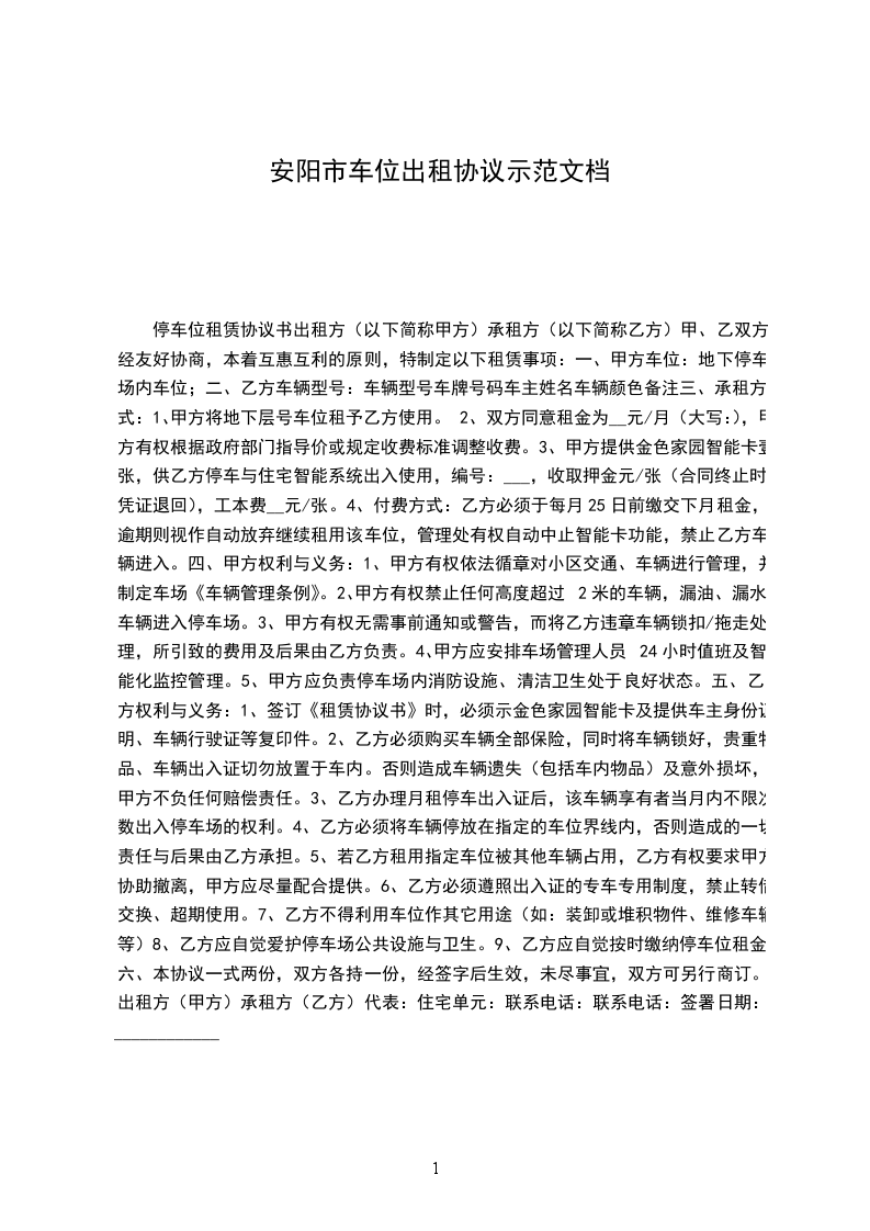 一、甲方向乙方提供小区的停车位,车位号码是号,用于停放车型:___,车牌号码:。