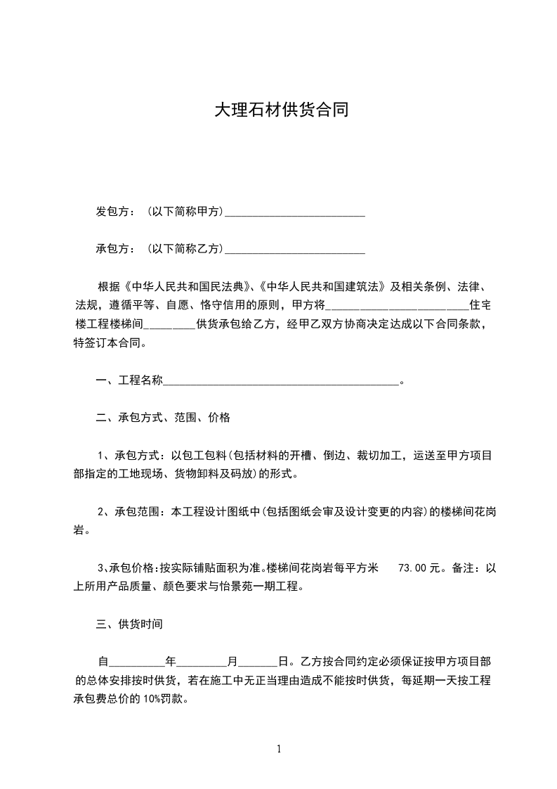 根据《中华人民共和国民法典》、《中华人民共和国建筑法》及相关条例、法律、法规,遵循平等、自愿、恪守信用的原则,甲方将_________________________住宅楼工程楼梯间_________供货承包给乙方,经甲乙双方协商决定达成以下合同条款,特签订本合同。