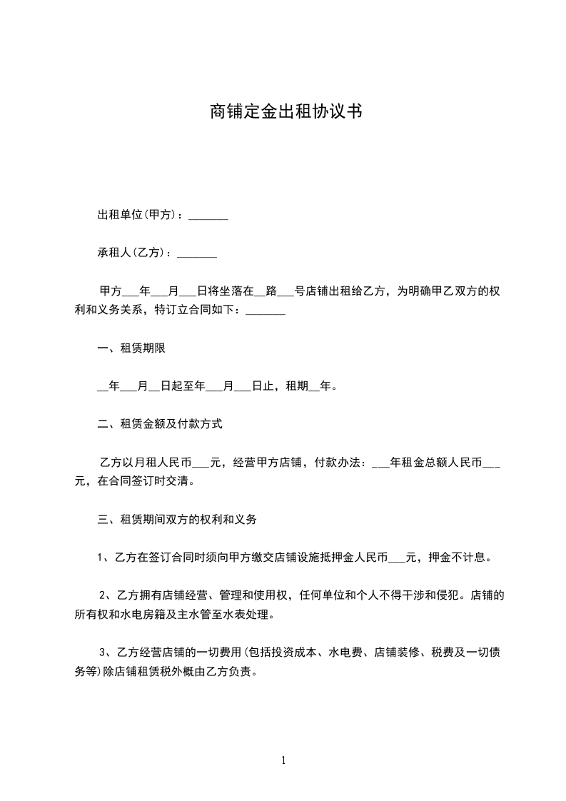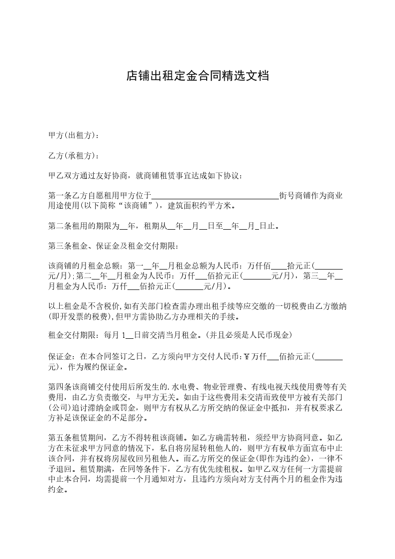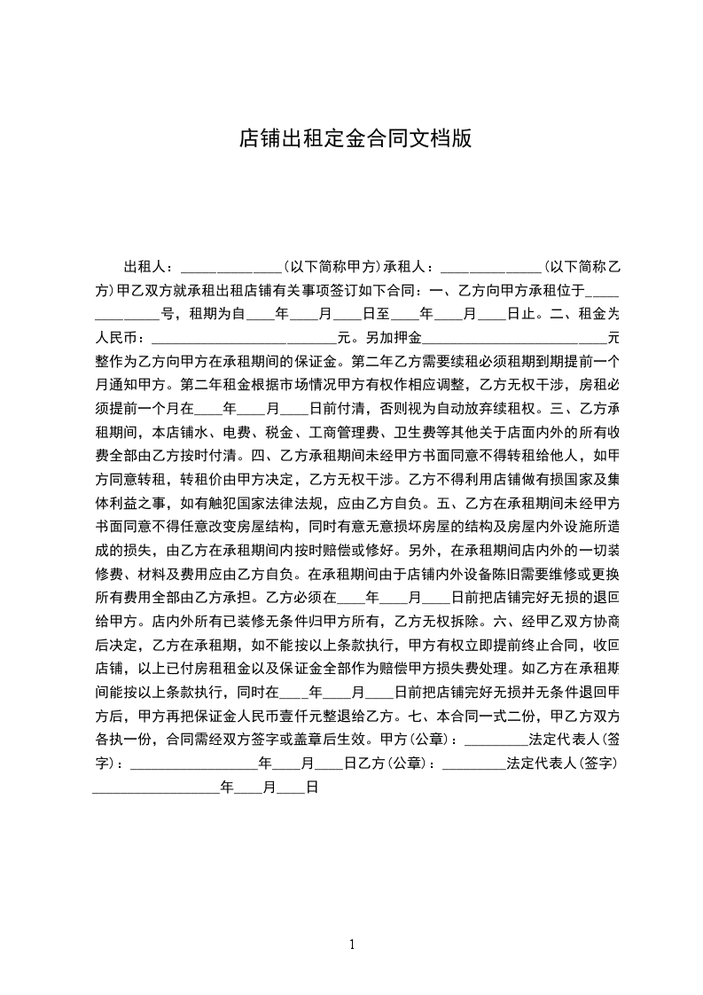 六、经甲乙双方协商后决定,乙方在承租期,如不能按以上条款执行,甲方有权立即提前终止合同,收回店铺,以上已付房租租金以及保证金全部作为赔偿甲方损失费处理。如乙方在承租期间能按以上条款执行,同时在____年____月____日前把店铺完好无损并无条件退回甲方后,甲方再把保证金人民币壹仟元整退给乙方。