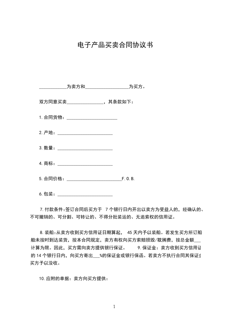 8.装船:从卖方收到买方信用证日期算起,45天内予以装船。若发生买方所订船舶未按时到达装货,按本合同规定,卖方有权向买方索赔损毁/耽搁费,按总金额___%计算为限。因此,买方需向卖方提供银行保证。 9.保证金:卖方收到买方信用证的14个银行日内,向买方寄出___%的保证金或银行保函。若卖方不执行合同其保证金买方予以没收。