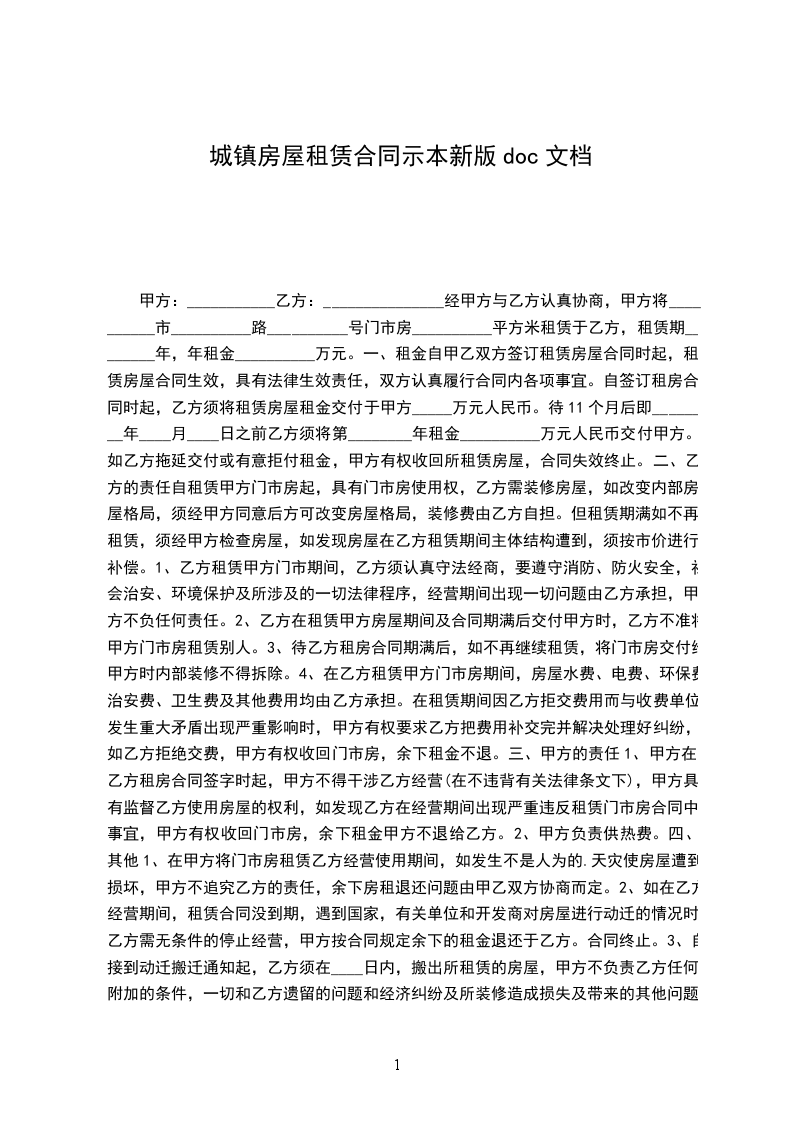 经甲方与乙方认真协商,甲方将__________市__________路__________号门市房__________平方米租赁于乙方,租赁期________年,年租金__________万元。