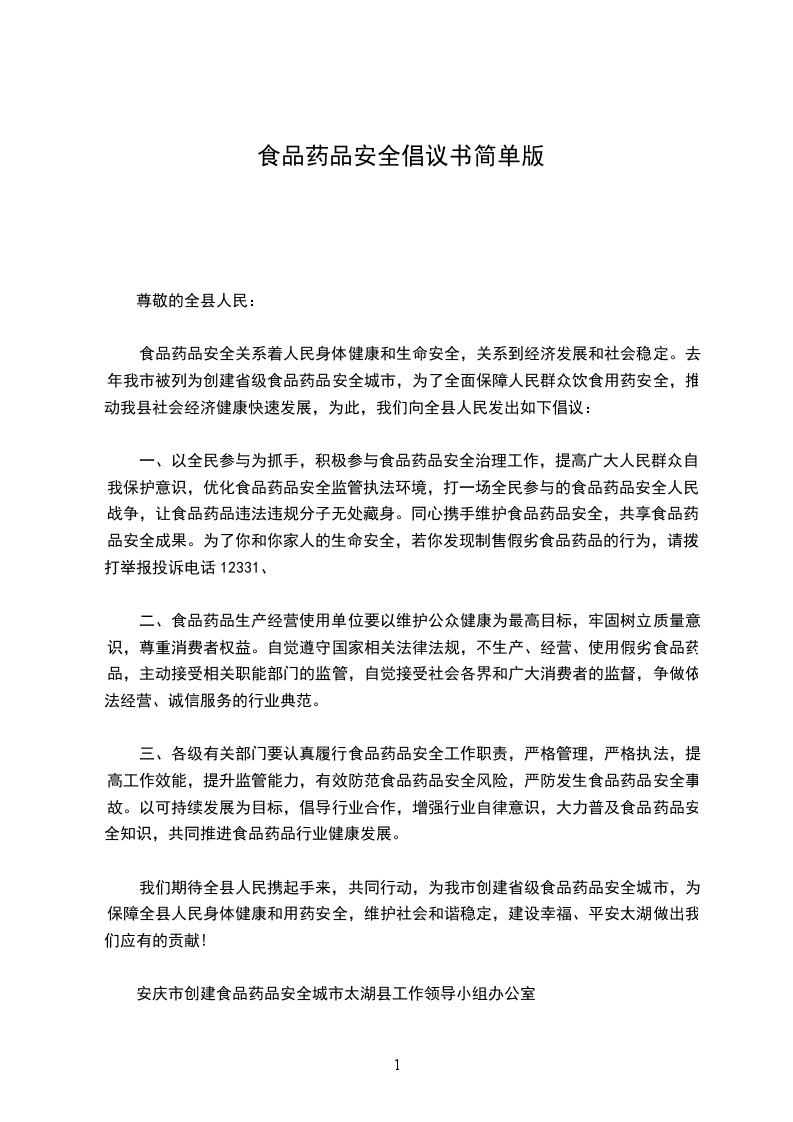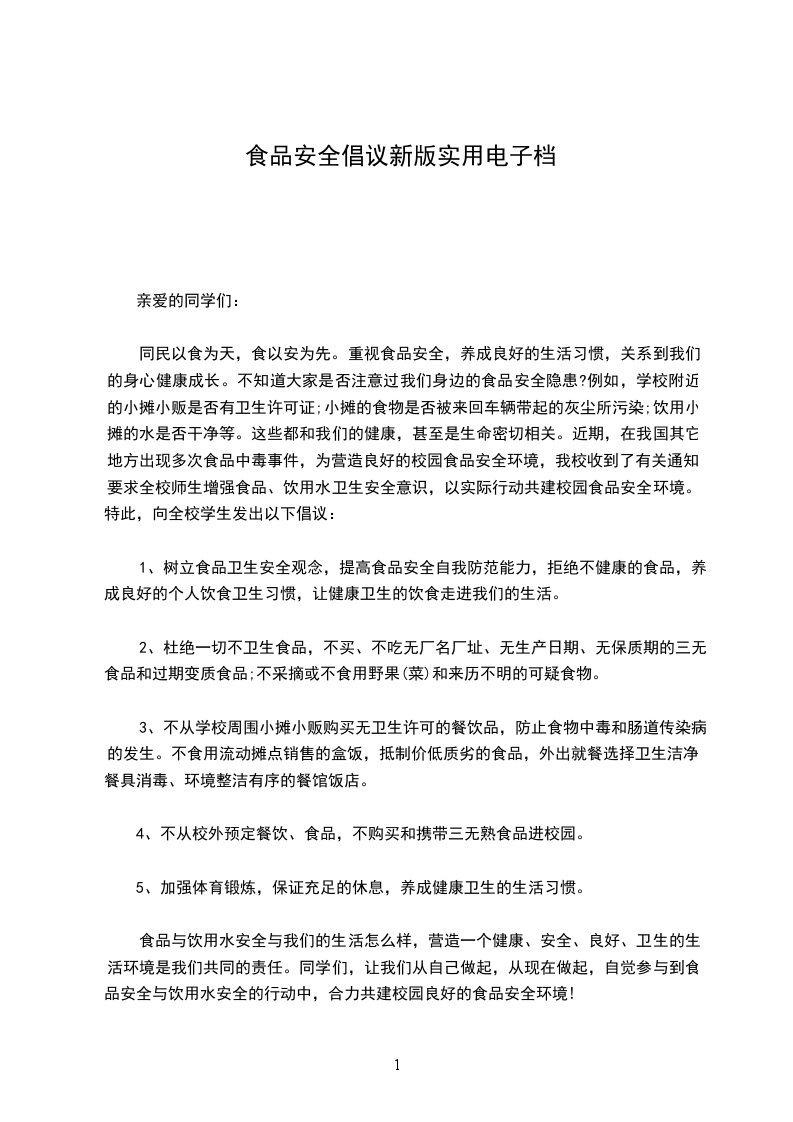 同民以食为天,食以安为先。重视食品安全,养成良好的生活习惯,关系到我们的身心健康成长。不知道大家是否注意过我们身边的食品安全隐患?例如,学校附近的小摊小贩是否有卫生许可证;小摊的食物是否被来回车辆带起的灰尘所污染;饮用小摊的水是否干净等。这些都和我们的健康,甚至是生命密切相关。近期,在我国其它地方出现多次食品中毒事件,为营造良好的校园食品安全环境,我校收到了有关通知,要求全校师生增强食品、饮用水卫生安全意识,以实际行动共建校园食品安全环境。特此,向全校学生发出以下倡议: