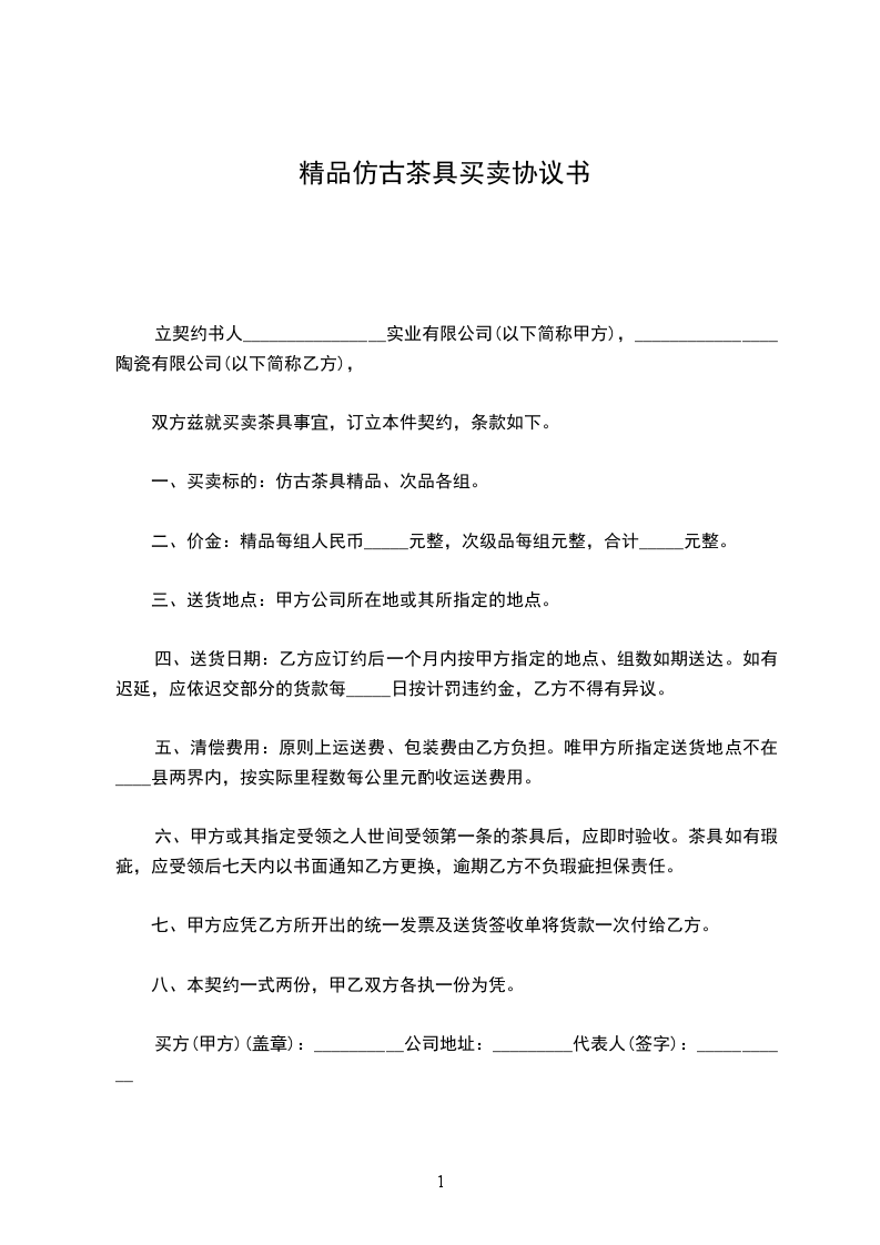 一、 买卖标的:仿古茶具精品、次品各一百组。(样式、规格另行列表)