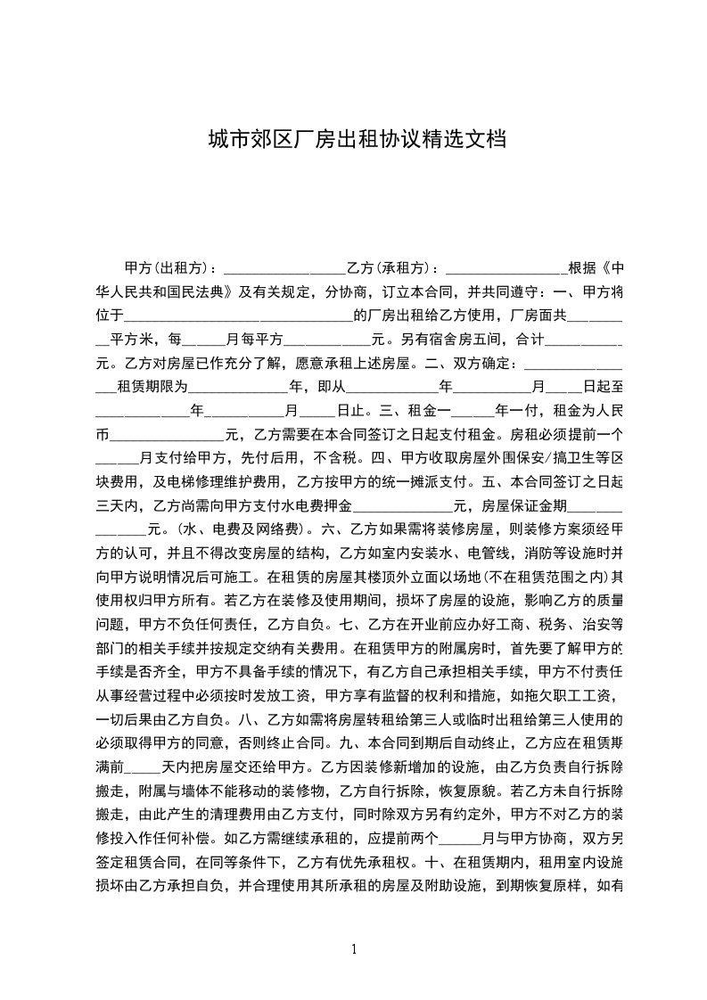一、甲方将位于________________________________的厂房出租给乙方使用,厂房面共__________平方米,每______月每平方____________元。另有宿舍房五间,合计___________元。乙方对房屋已作充分了解,愿意承租上述房屋。