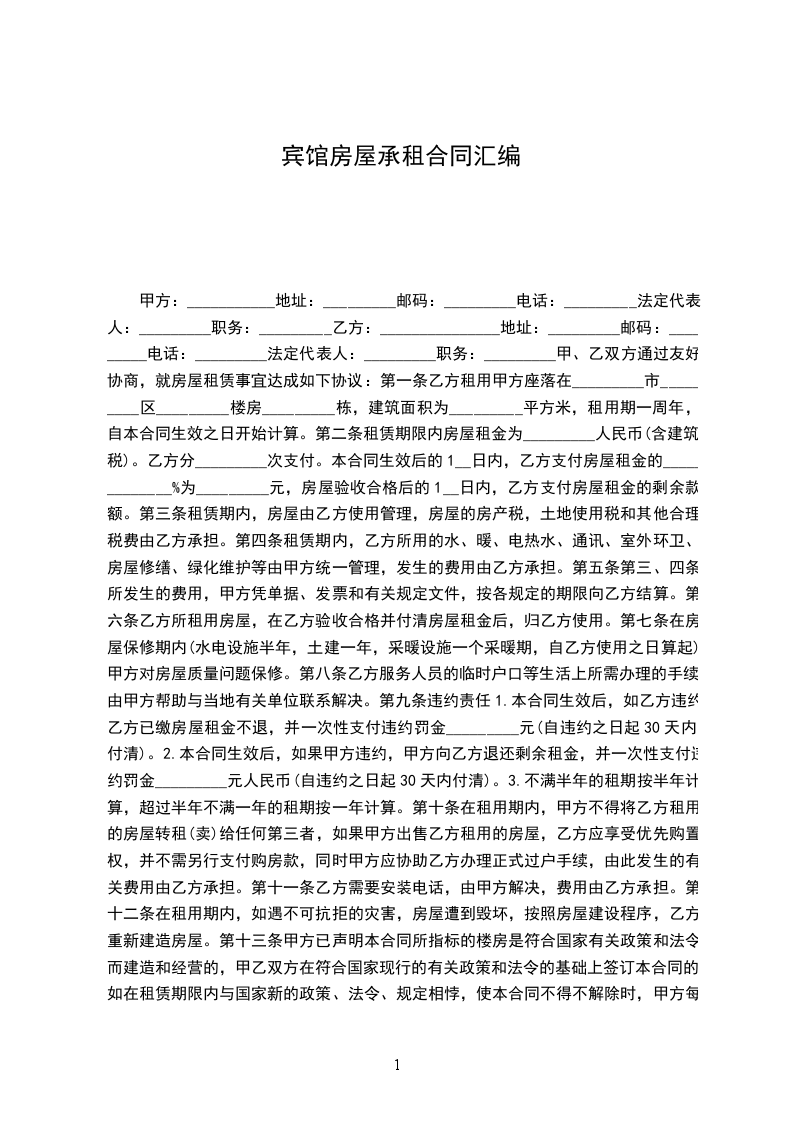 第一条乙方租用甲方座落在_________市_________区_________楼房_________栋,建筑面积为_________平方米,租用期一周年,自本合同生效之日开始计算。