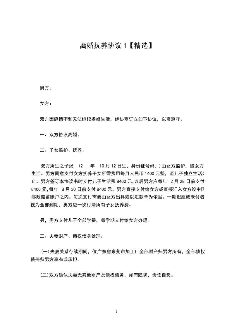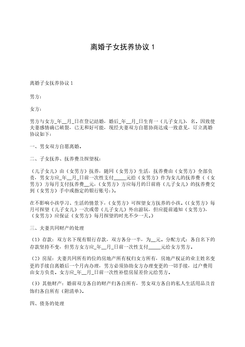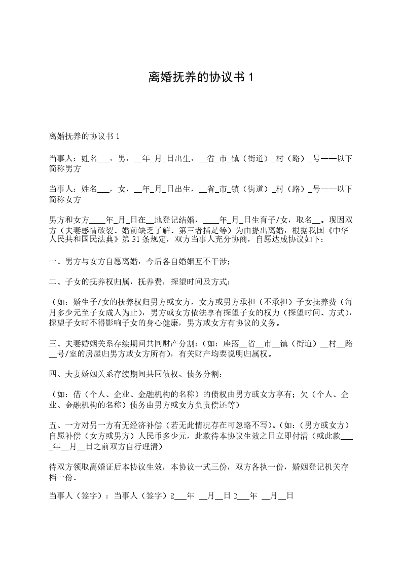 八、本协议书一式三份,甲乙双方各执一份,婚姻登记部门保留一份。在双方签字,并经婚姻登记机关办理离婚手续后生效。