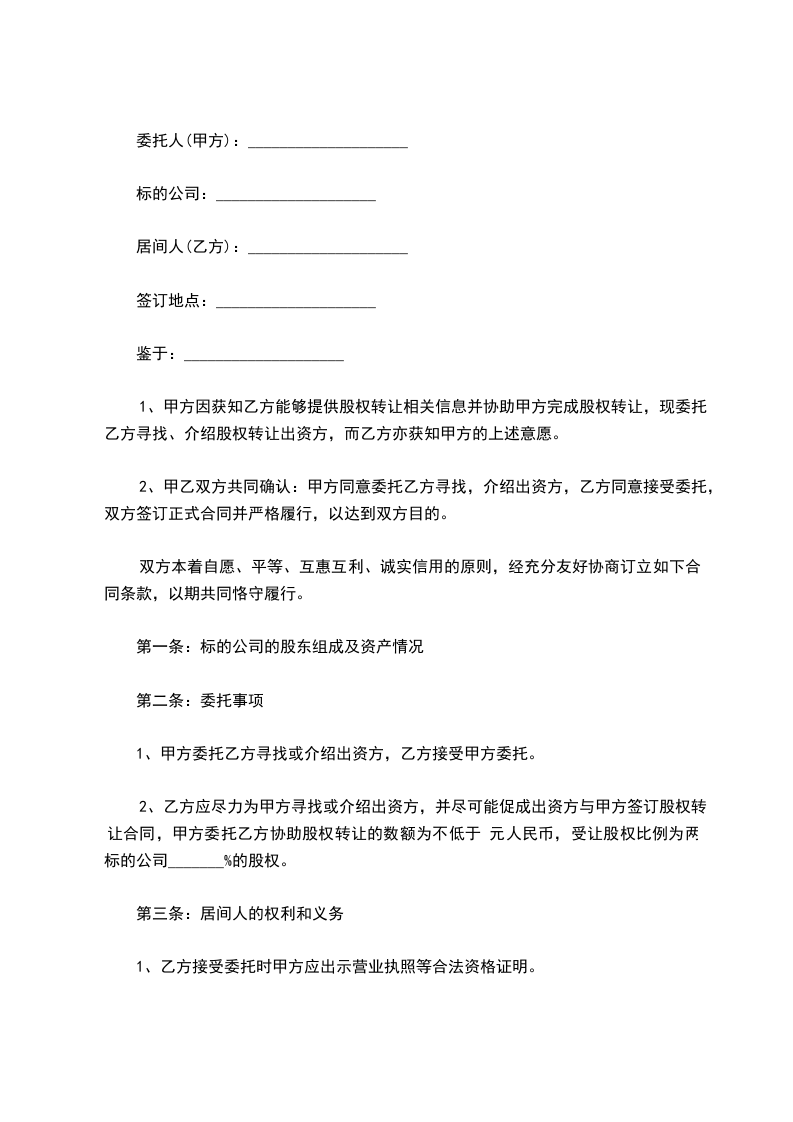 1、甲方因获知乙方能够提供股权转让相关信息并协助甲方完成股权转让,现委托乙方寻找、介绍股权转让出资方,而乙方亦获知甲方的上述意愿。