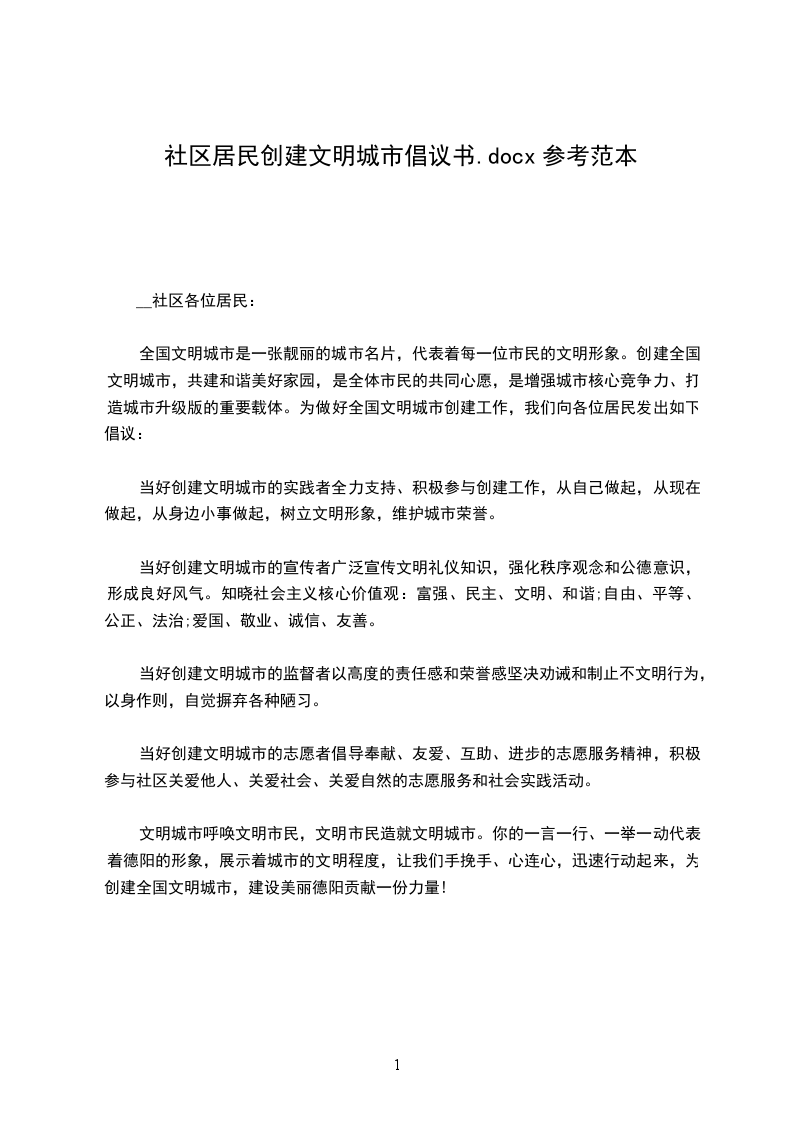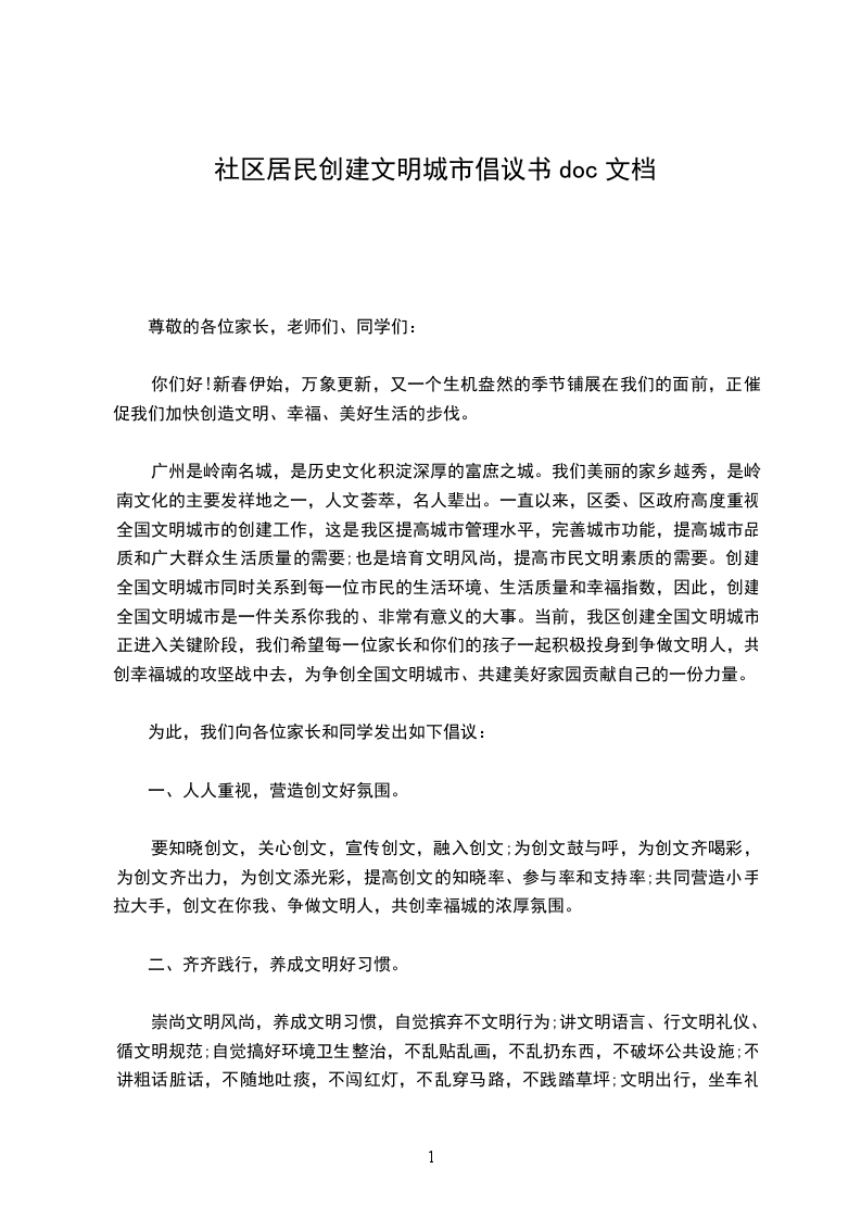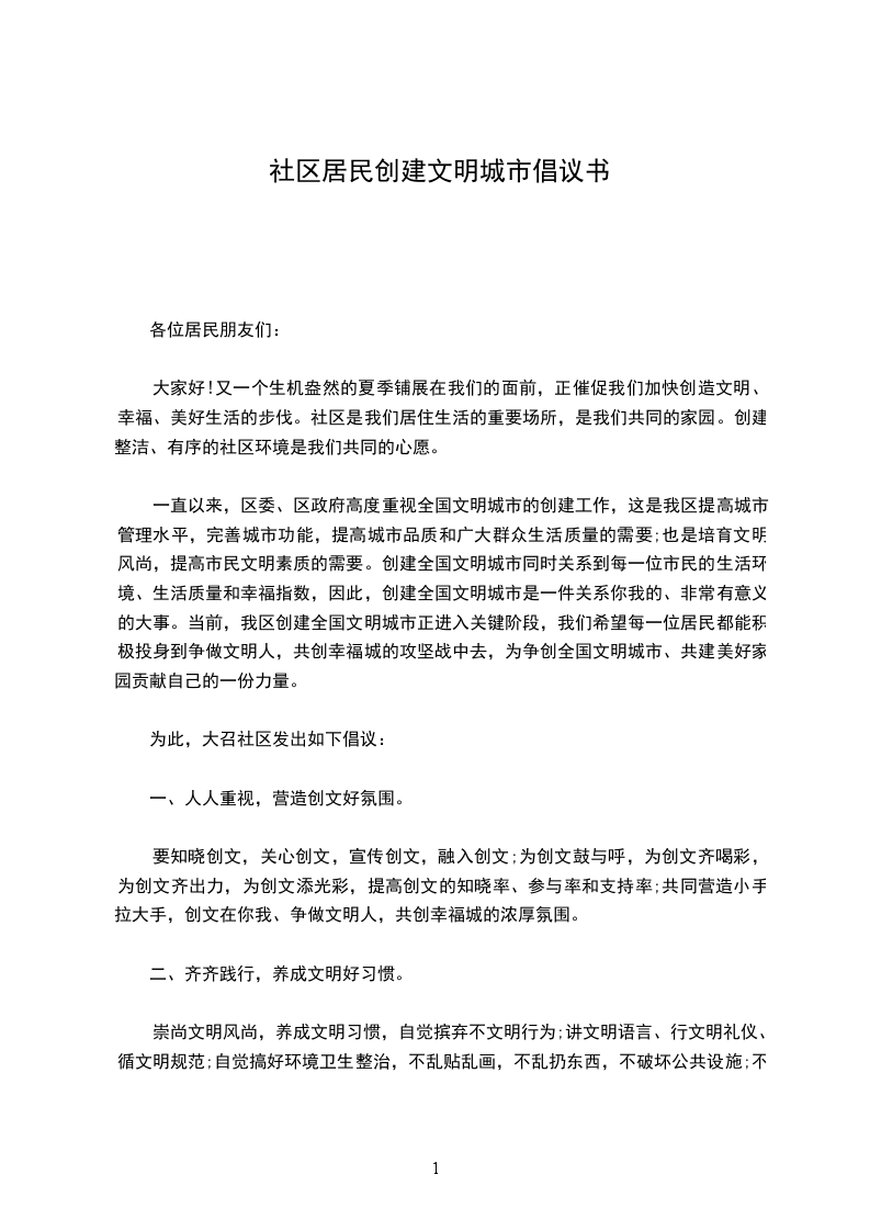 全国文明城市是一张靓丽的城市名片,代表着每一位市民的文明形象。创建全国文明城市,共建和谐美好家园,是全体市民的共同心愿,是增强城市核心竞争力、打造城市升级版的重要载体。为做好全国文明城市创建工作,我们向各位居民发出如下倡议: