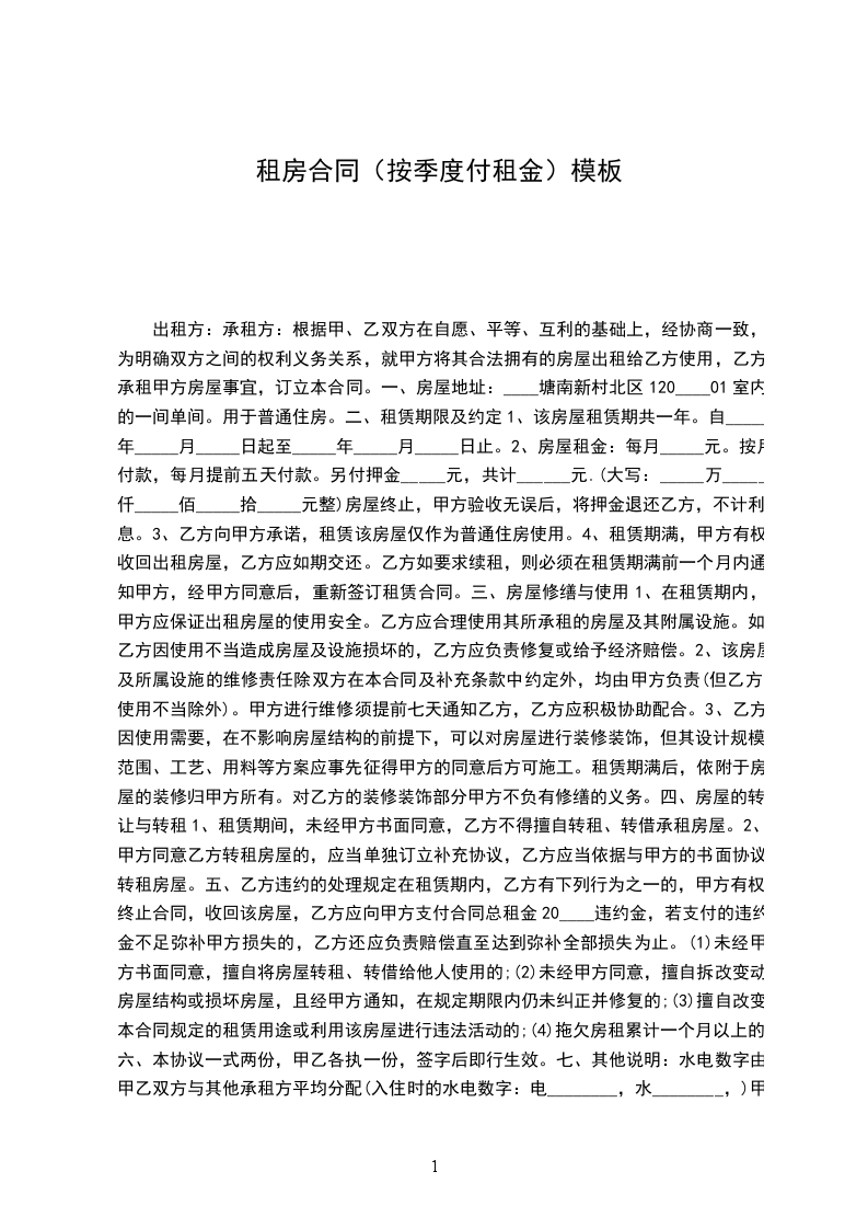 一、甲乙双方商定,甲方将___________市___________小区___________栋___________单元___________楼___________号,使用面积___________平方米的房屋租给乙方使用,期限自__________年__________月__________日至__________年__________月__________日,租用期限___________月。