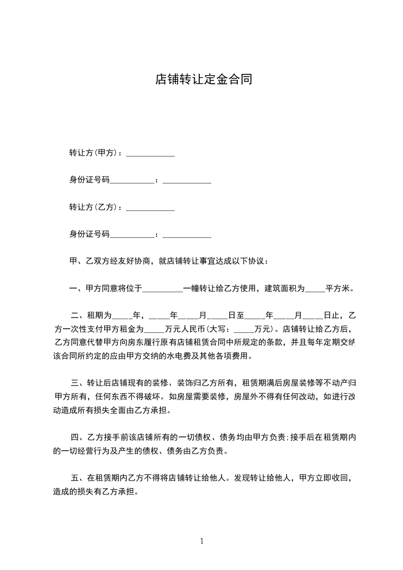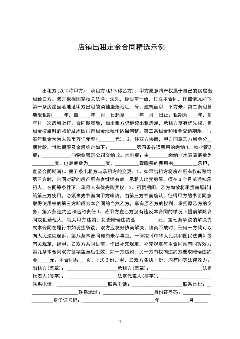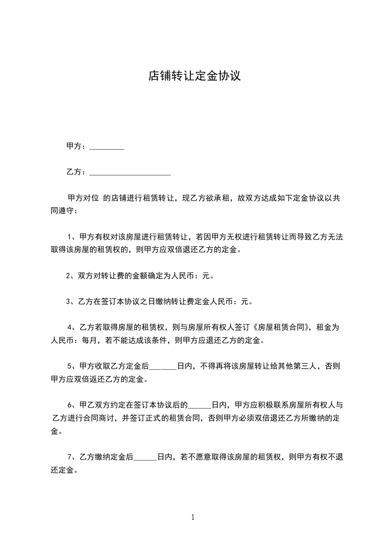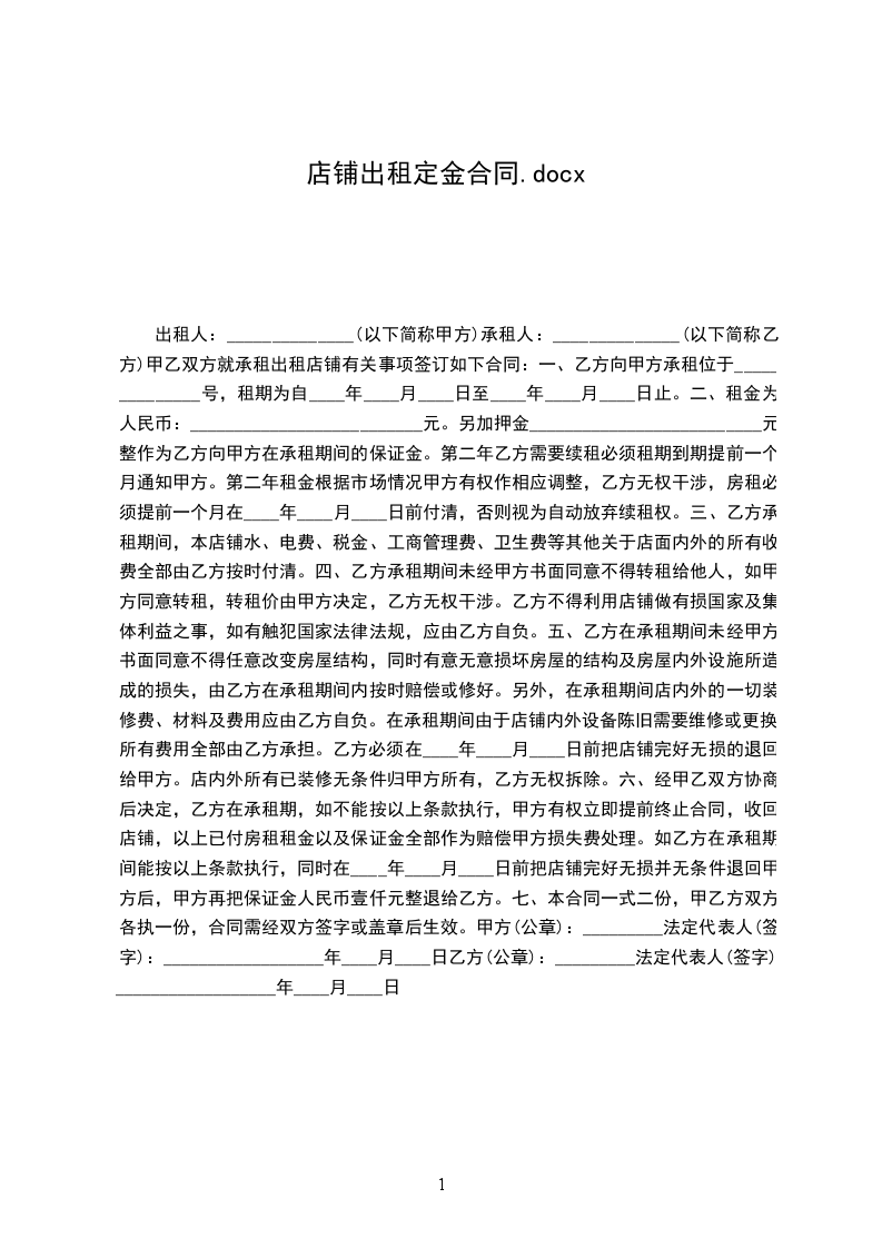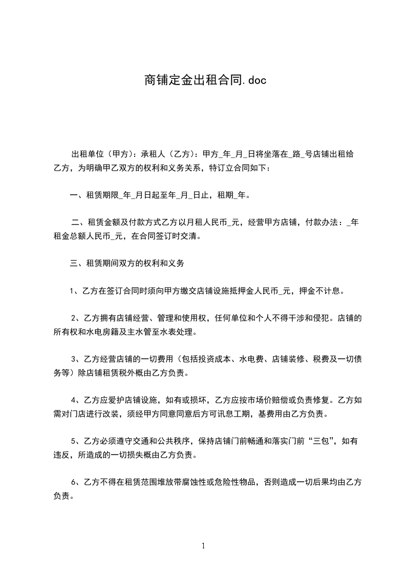 六、经甲乙双方协商后决定,乙方在承租期,如不能按以上条款执行,甲方有权立即提前终止合同,收回店铺,以上已付房租租金以及保证金全部作为赔偿甲方损失费处理。如乙方在承租期间能按以上条款执行,同时在____年____月____日前把店铺完好无损并无条件退回甲方后,甲方再把保证金人民币壹仟元整退给乙方。