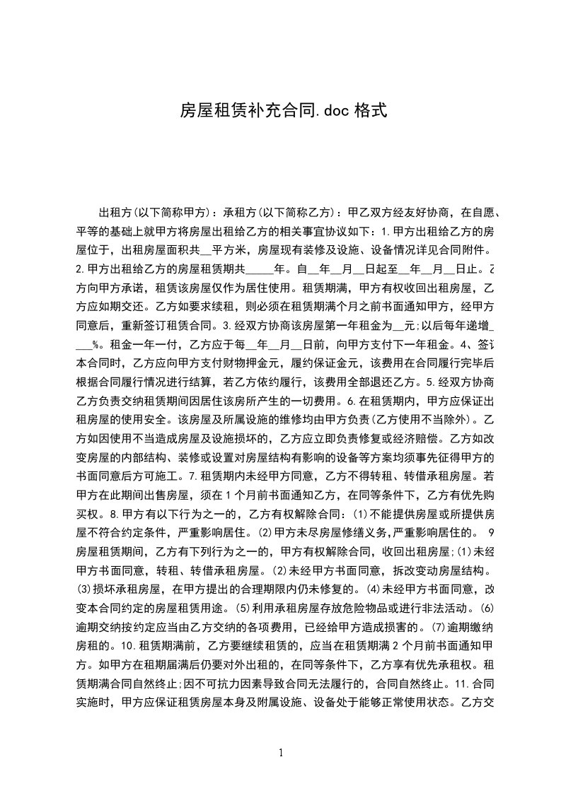双方于_________年_________月_________日签订的《房屋租赁合同》现已履行了三年,根据合同约定后两年的租金需双方另行协商,现双方经协商一致,就房屋租赁价格等续租事宜,达成补充协议如下;