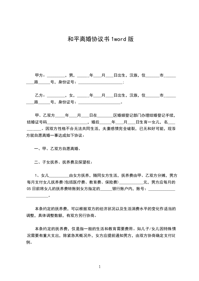甲、乙双方_____年____月____日在________区婚姻登记部门办理结婚登记手续,结婚证号码____________________,婚后______年____月____日生育一女儿,名___________。因双方性格不合无法共同生活,夫妻感情完全破裂,已无和好可能,现双方就自愿离婚一事达成如下协议: