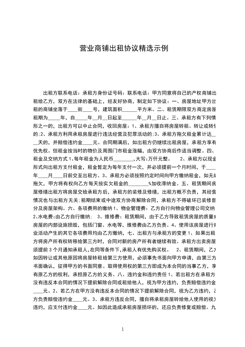 1、若出租方在承租方没有违反本合同的情况下提前解除合同或租给他人,视为甲方违约,负责赔偿违约金____元。
