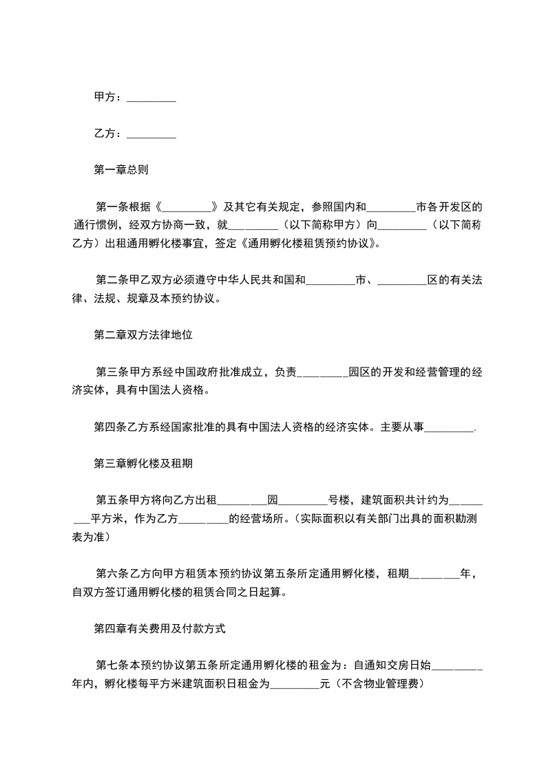 第一条根据《_________》及其它有关规定,参照国内和_________市各开发区的通行惯例,经双方协商一致,就_________(以下简称甲方)向_________(以下简称乙方)出租通用孵化楼事宜,签定《通用孵化楼租赁预约协议》。
