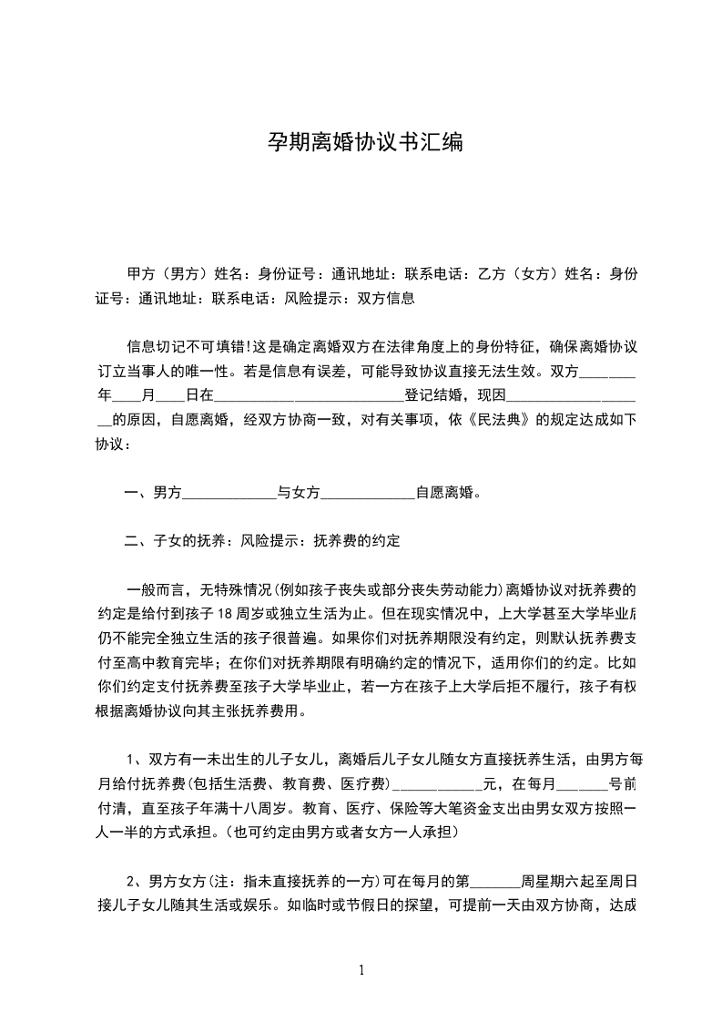1、双方有一未出生的儿子/女儿,离婚后儿子/女儿随男方/女方直接抚养生活,由女方/男方每月给付抚养费(包括生活费、教育费、医疗费)______元,在每月__号前付清,直到孩子完成高中教育阶段止。高中教育阶段之后的有关费用双方日后重新协商。
