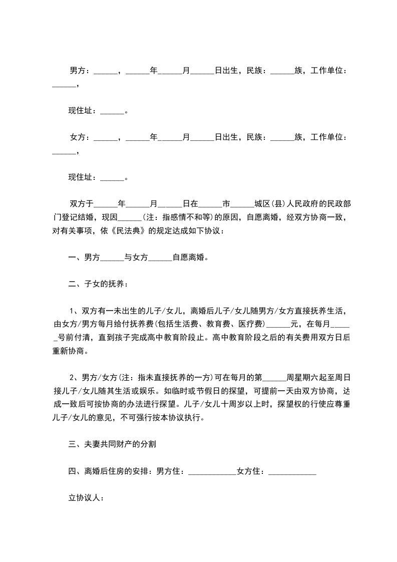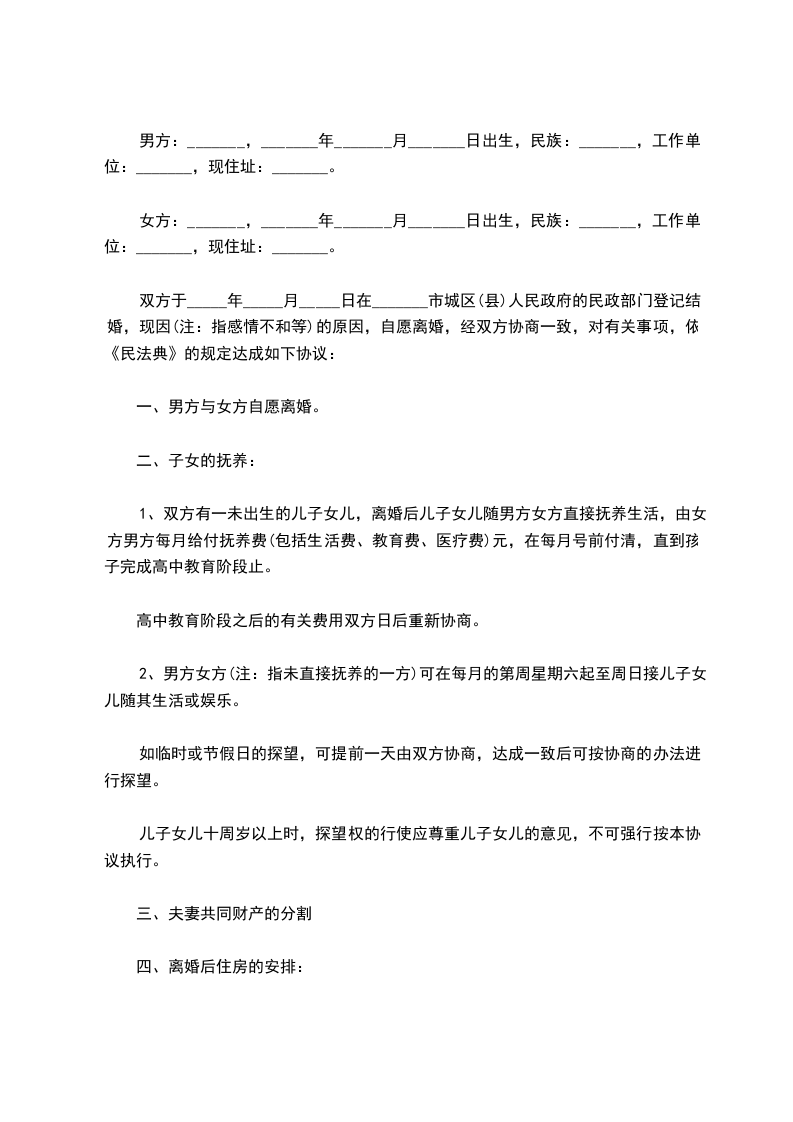 双方__年__月__日在__市__城区(县)人民政府的民政部门登记结婚,现因______(注:指感情不和等)的原因,自愿离婚,经双方协商一致,对有关事项,依据《中华人民共和国民法典》的规定达成如下协议:
