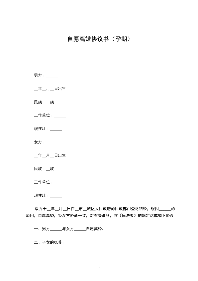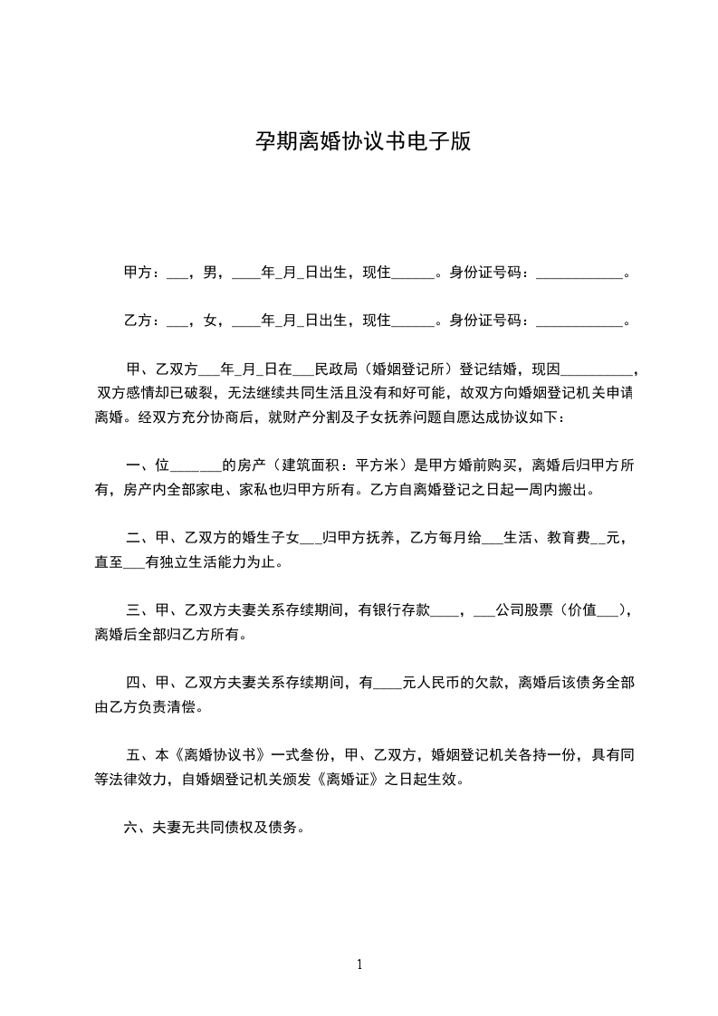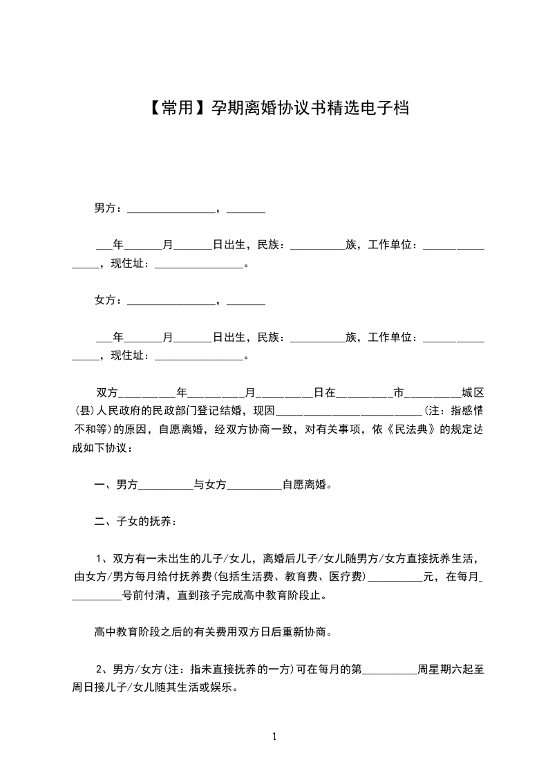 1、双方有一未出生的孩子,孩子出生后哺乳期结束前共____年____月,由____方直接抚养生活;孩子哺乳期结束后,双方可另行协商抚养权归属。