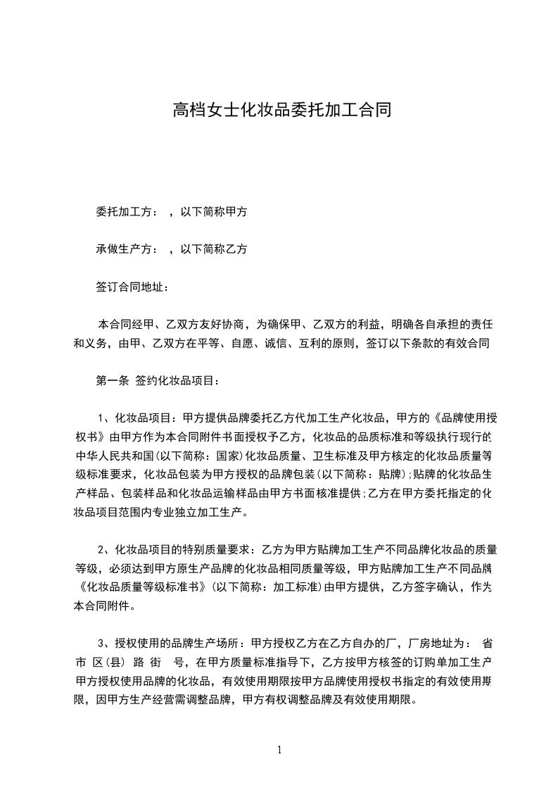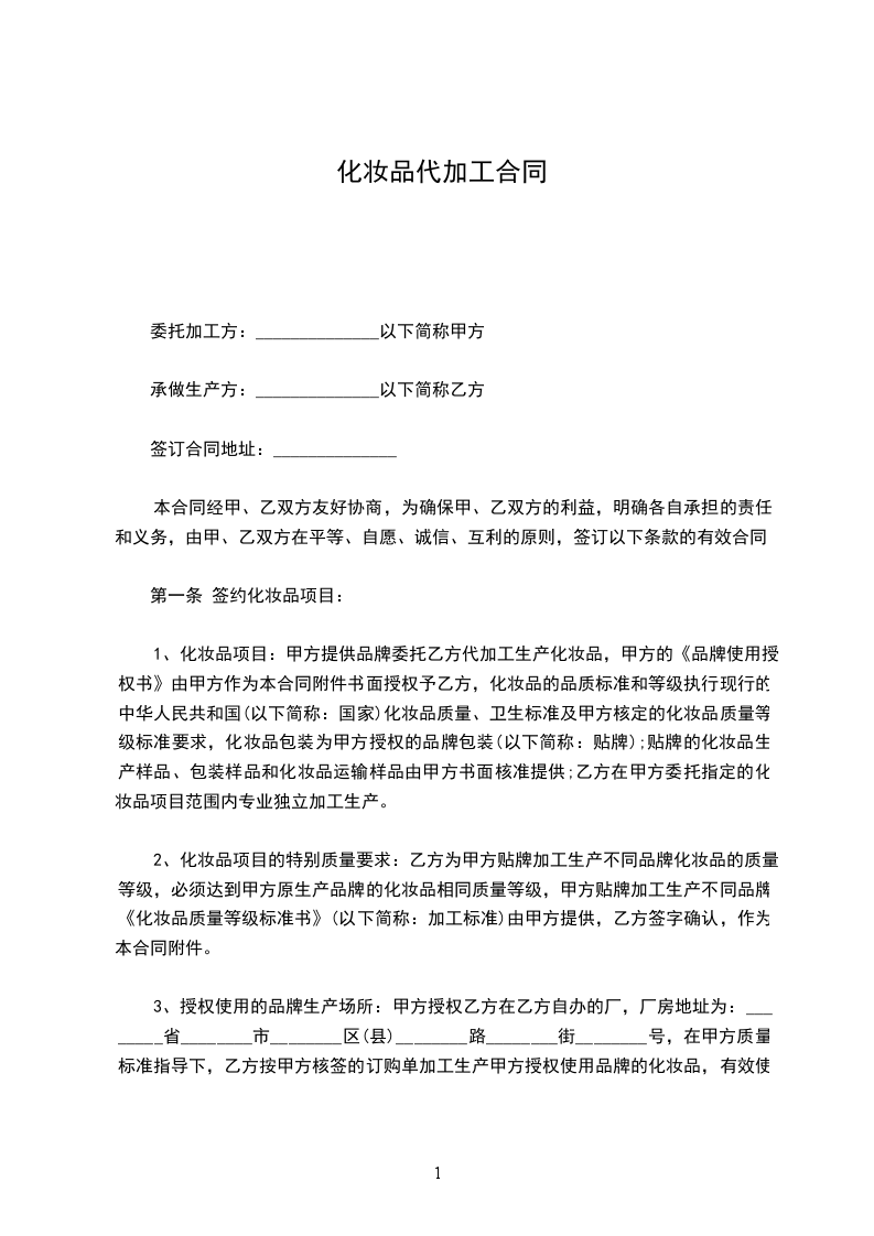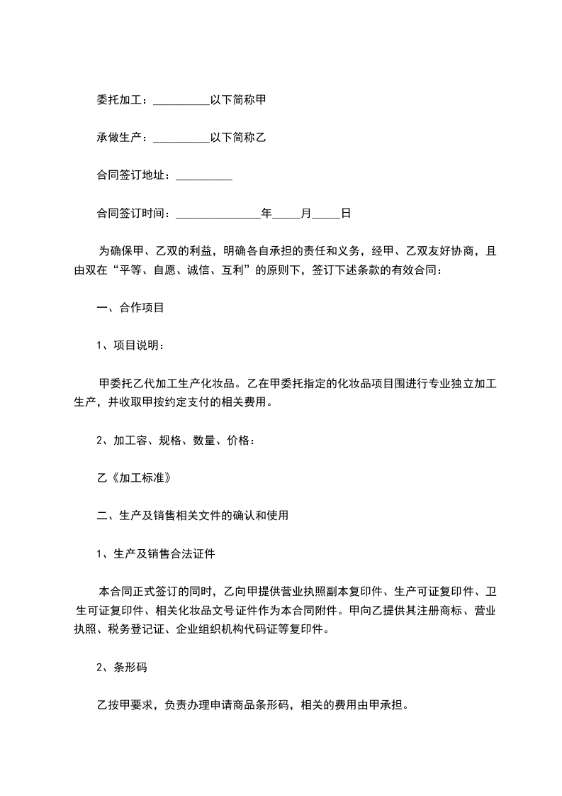 1、化妆品项目:甲方提供品牌委托乙方代加工生产化妆品,甲方的《品牌使用授权书》由甲方作为本合同附件书面授权予乙方,化妆品的品质标准和等级执行现行的中华人民共和国(以下简称:国家)化妆品质量、卫生标准及甲方核定的化妆品质量等级标准要求,化妆品包装为甲方授权的品牌包装(以下简称:贴牌);贴牌的化妆品生产样品、包装样品和化妆品运输样品由甲方书面核准提供;乙方在甲方委托指定的化妆品项目范围内专业独立加工生产。