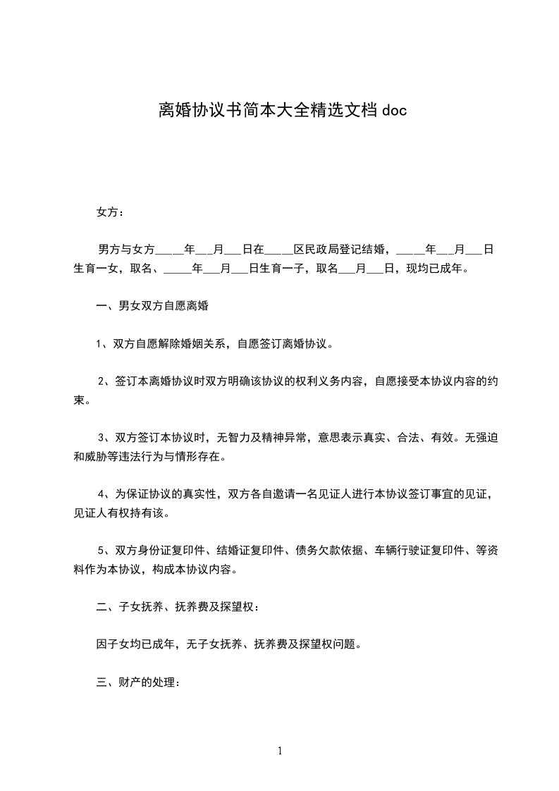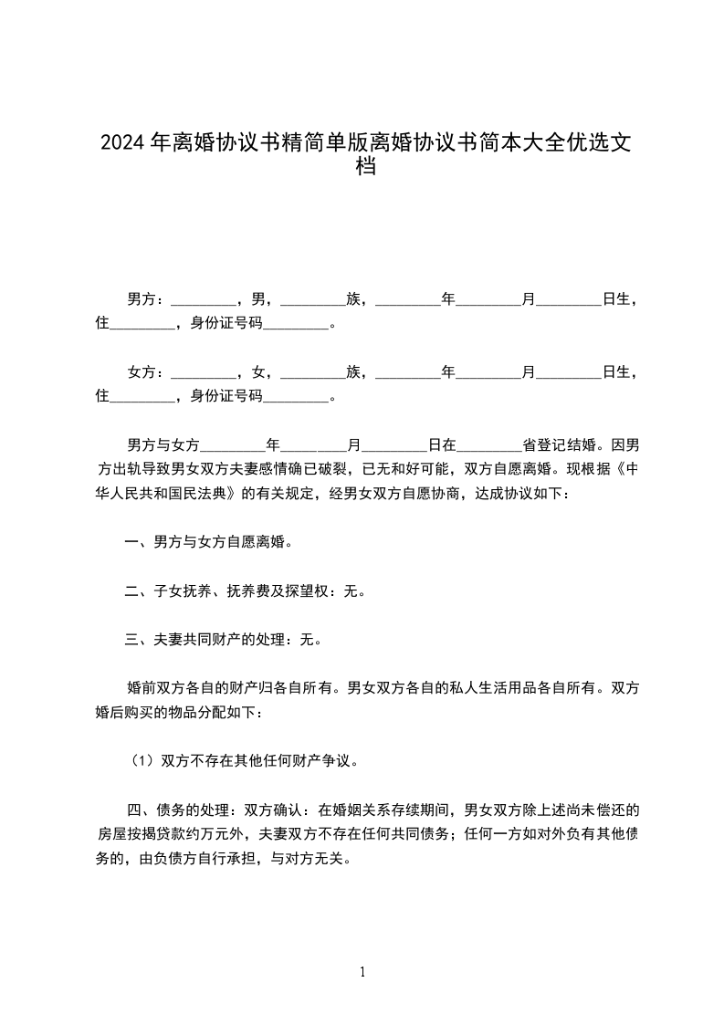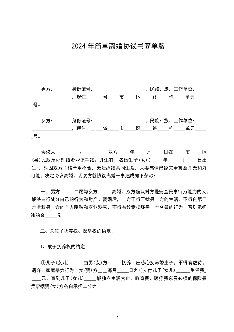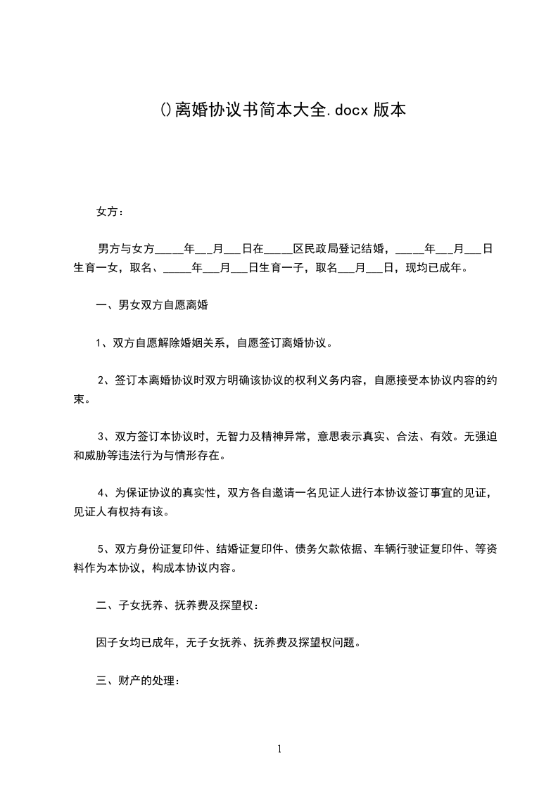 一、男方______自愿与女方______离婚。双方确认对方是完全民事行为能力的人,能够自行处分自己的行为和财产。离婚后,一方不得干扰另一方的生活,不得向第三方泄漏另一方的个人隐私和商业秘密,不得有故意损坏另一方名誉的行为,否则承担违约金_____元。