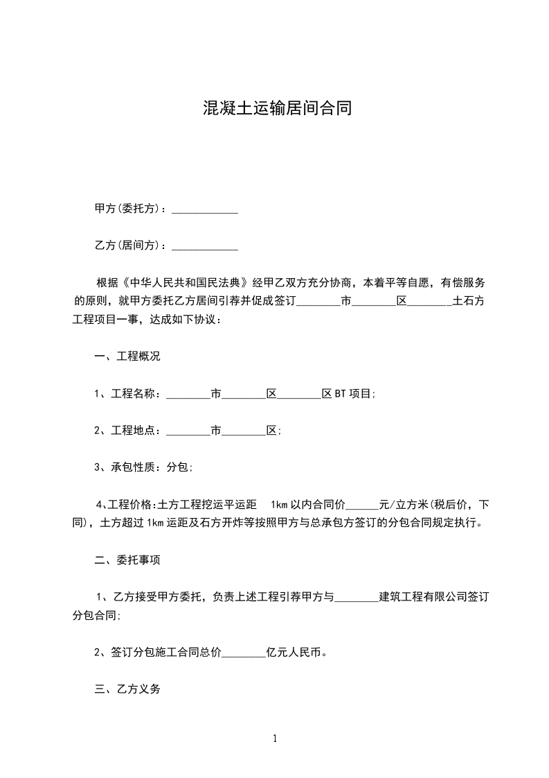 根据《中华人民共和国民法典》经甲乙双方充分协商,本着平等自愿,有偿服务的原则,就甲方委托乙方居间引荐并促成签订________市________区________土石方工程项目一事,达成如下协议: