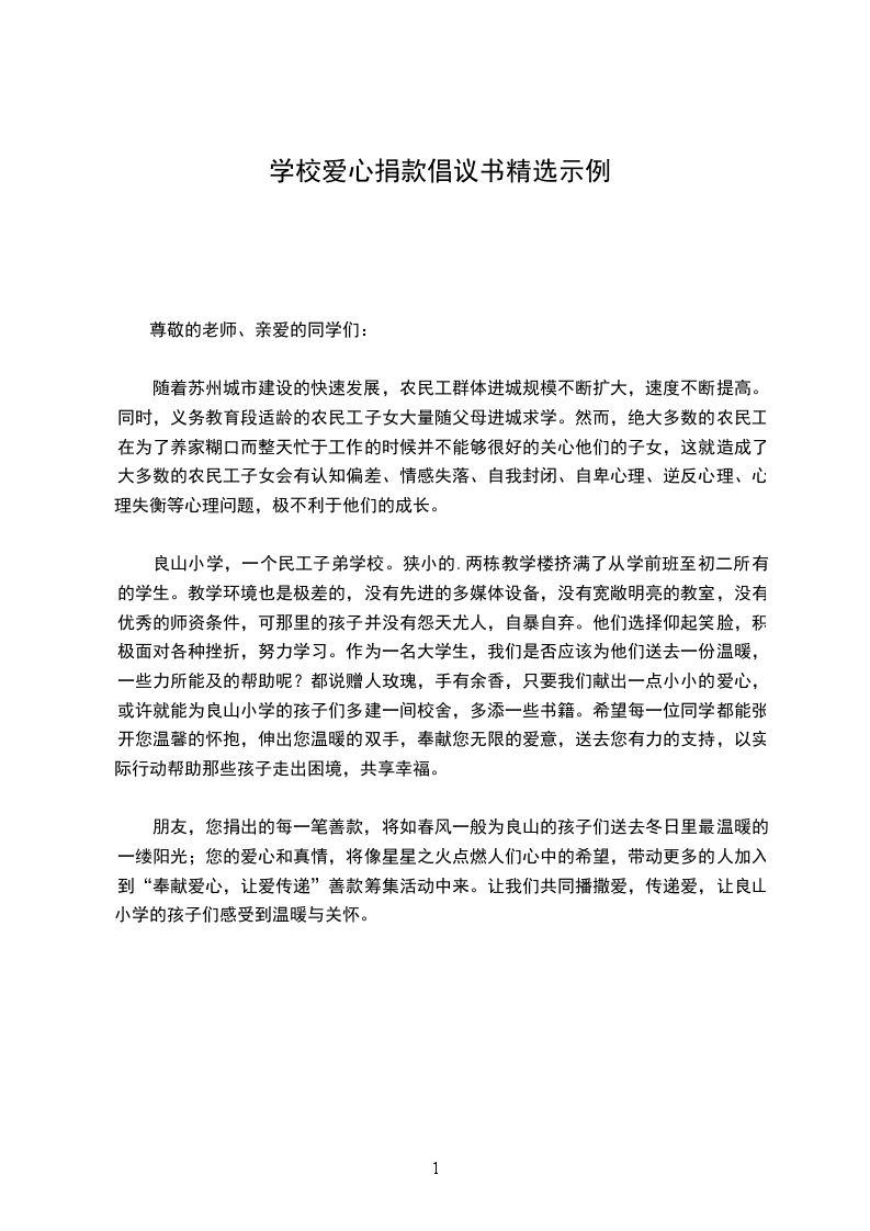 良山小学,一个民工子弟学校。狭小的.两栋教学楼挤满了从学前班至初二所有的学生。教学环境也是极差的,没有先进的多媒体设备,没有宽敞明亮的教室,没有优秀的师资条件,可那里的孩子并没有怨天尤人,自暴自弃。他们选择仰起笑脸,积极面对各种挫折,努力学习。作为一名大学生,我们是否应该为他们送去一份温暖,一些力所能及的帮助呢?都说赠人玫瑰,手有余香,只要我们献出一点小小的爱心,或许就能为良山小学的孩子们多建一间校舍,多添一些书籍。希望每一位同学都能张开您温馨的怀抱,伸出您温暖的双手,奉献您无限的爱意,送去您有力的支持,以实际行动帮助那些孩子走出困境,共享幸福。
