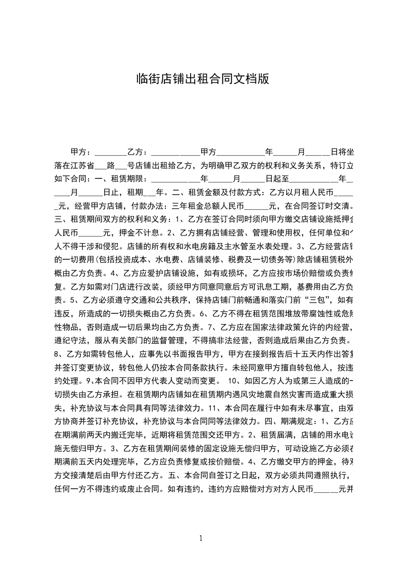 甲方____________年______月______日将坐落在江苏省___路___号店铺出租给乙方,为明确甲乙双方的权利和义务关系,特订立如下合同: