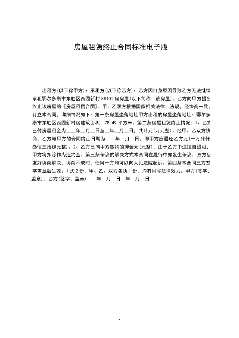乙方因自身原因导致乙方无法继续承租鄂尔多斯市东胜区西园新村8#101房房屋(以下简称:该房屋)。乙方向甲方提出终止该房屋的《房屋租赁合同》。甲、乙双方根据国家相关法律、法规,经协商一致,订立本合同,详细情况如下: