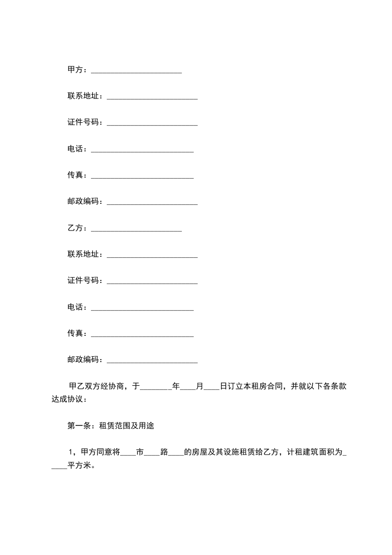 1、甲方同意将____市____区________号____室的房屋及其设施租赁给乙方,计租建筑面积为____平方米。
