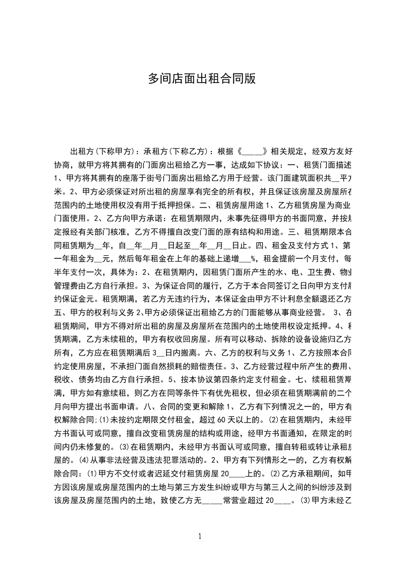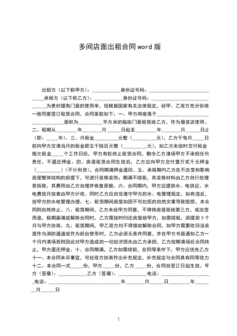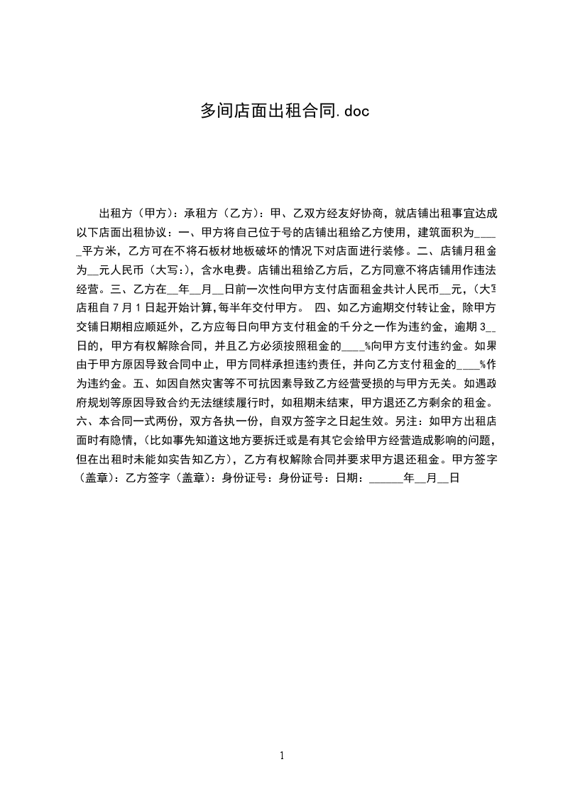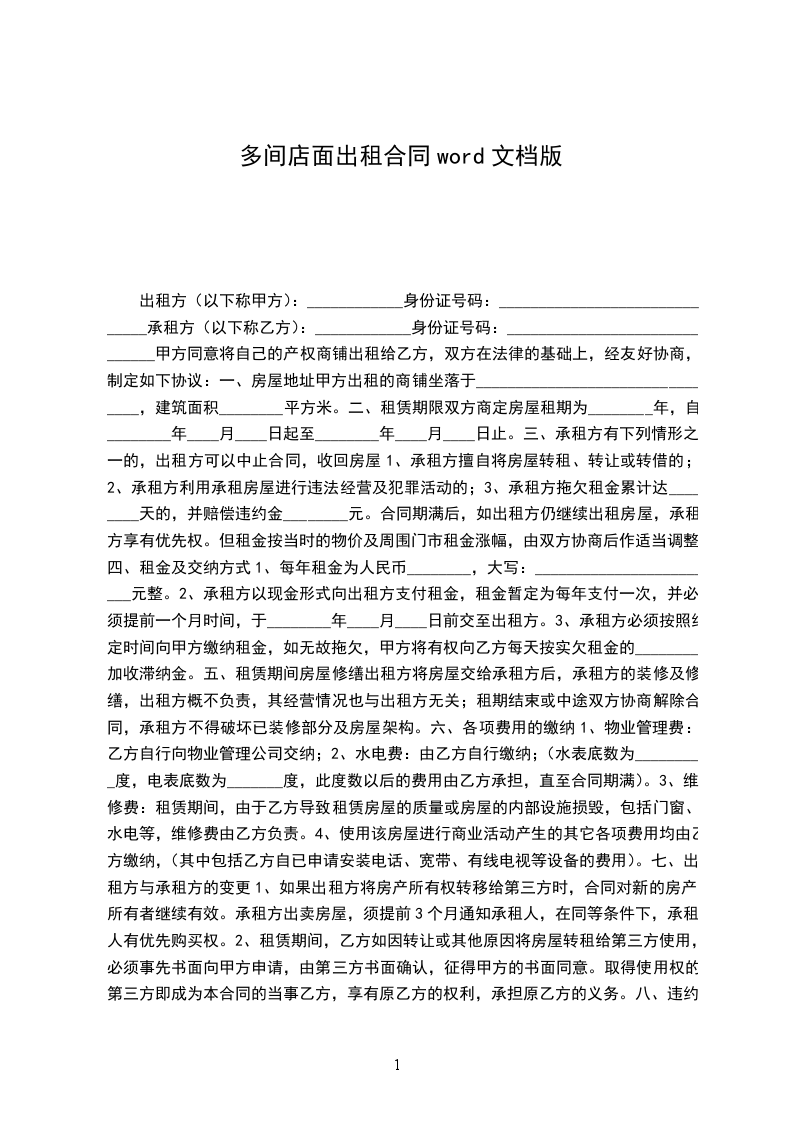 出租方(以下称甲方):____________身份证号码:______________________________承租方(以下称乙方):____________身份证号码:______________________________甲方同意将自己的产权商铺出租给乙方,双方在法律的基础上,经友好协商,制定如下协议: