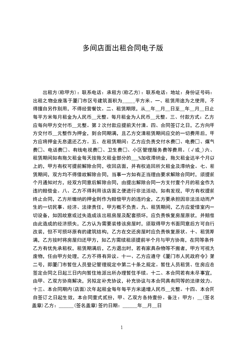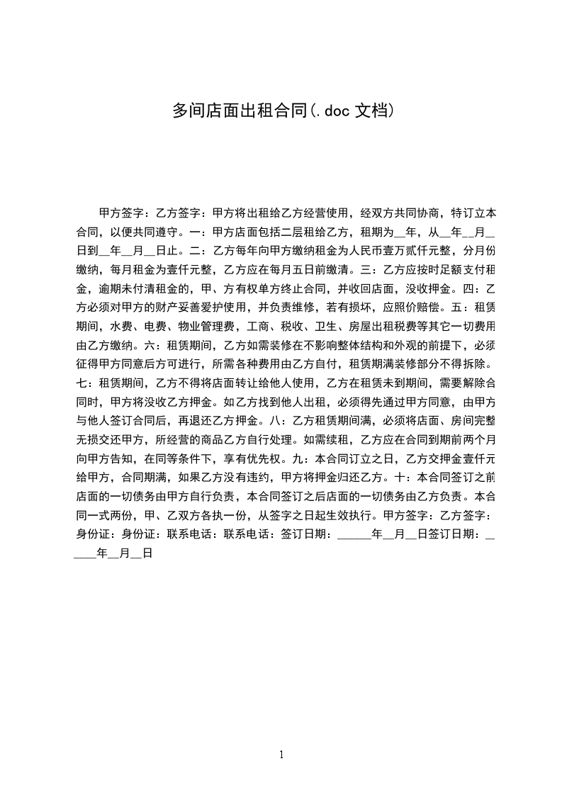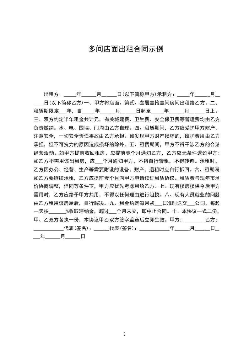 十二、本合同双方签字盖章后生效,本通用版合同式2份,甲、乙双方各执1份。甲方(签章):____________乙方(签章):____________电话:_____________________电话:_____________________________年____月____日至________年____月____日店面出租合同通用版0以下简称甲、乙方甲方:__乙方:______