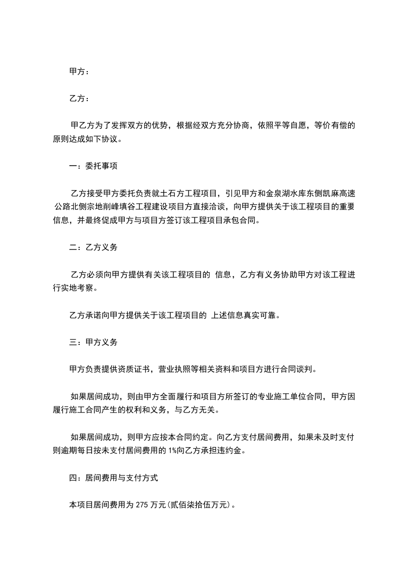乙方接受甲方委托负责就土石方工程项目,引见甲方和金泉湖水库东侧凯麻高速公路北侧宗地削峰填谷工程建设项目方直接洽谈,向甲方提供关于该工程项目的重要信息,并最终促成甲方与项目方签订该工程项目承包合同。
