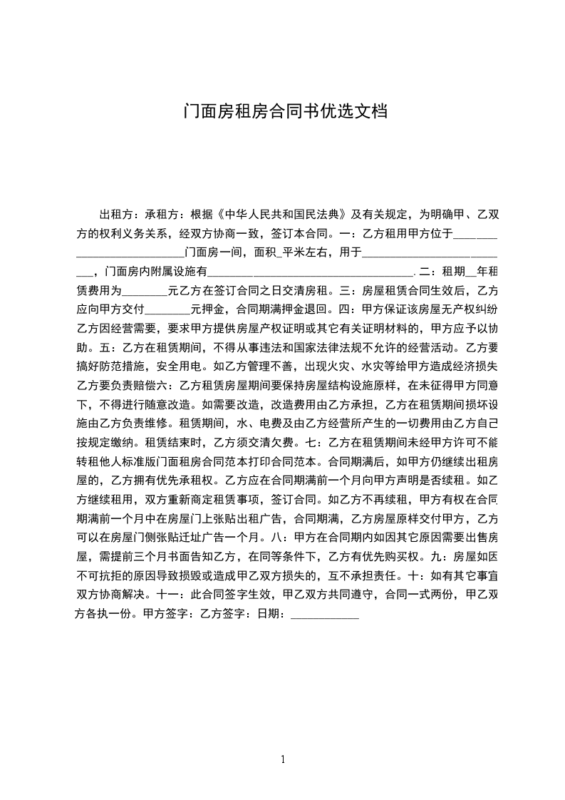 一:乙方租用甲方位于___________________________门面房一间,面积_平米左右,用于___________________________,门面房内附属设施有____________________________________.