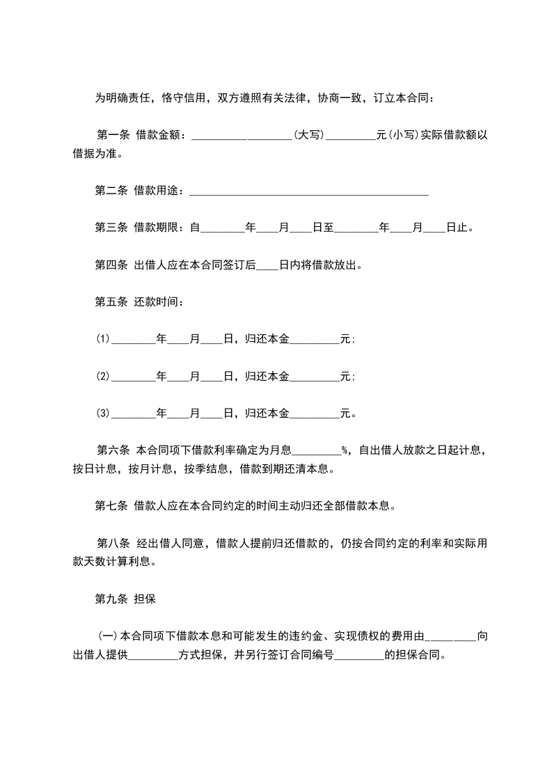 借款总金额:人民币______元,(大写______)。借款期限:自______年____月____日至______年____月____日。月利息______%。到______年____月____日还清。若届时不能全部还款,每延期一日,甲方需按照全部借款的______%支付迟延履行金。
