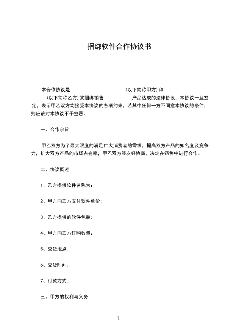 本合作协议是_______________________(以下简称甲方)和_________________________(以下简称乙方)就捆绑销售____________产品达成的法律协议,本协议一旦签定,表示甲乙双方均接受本协议的各项约束,若其中任何一方不同意本协议的条件,则应该对本协议不予签署。