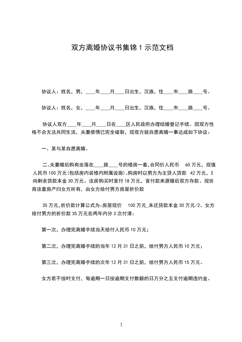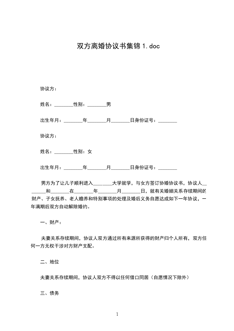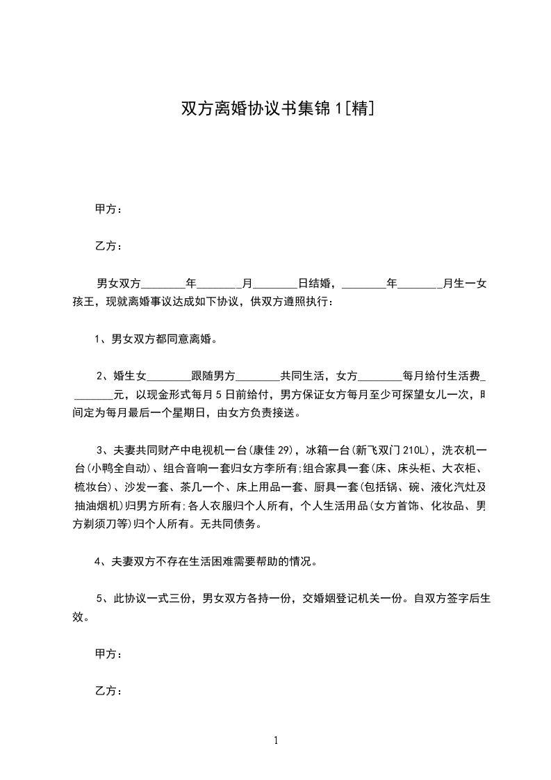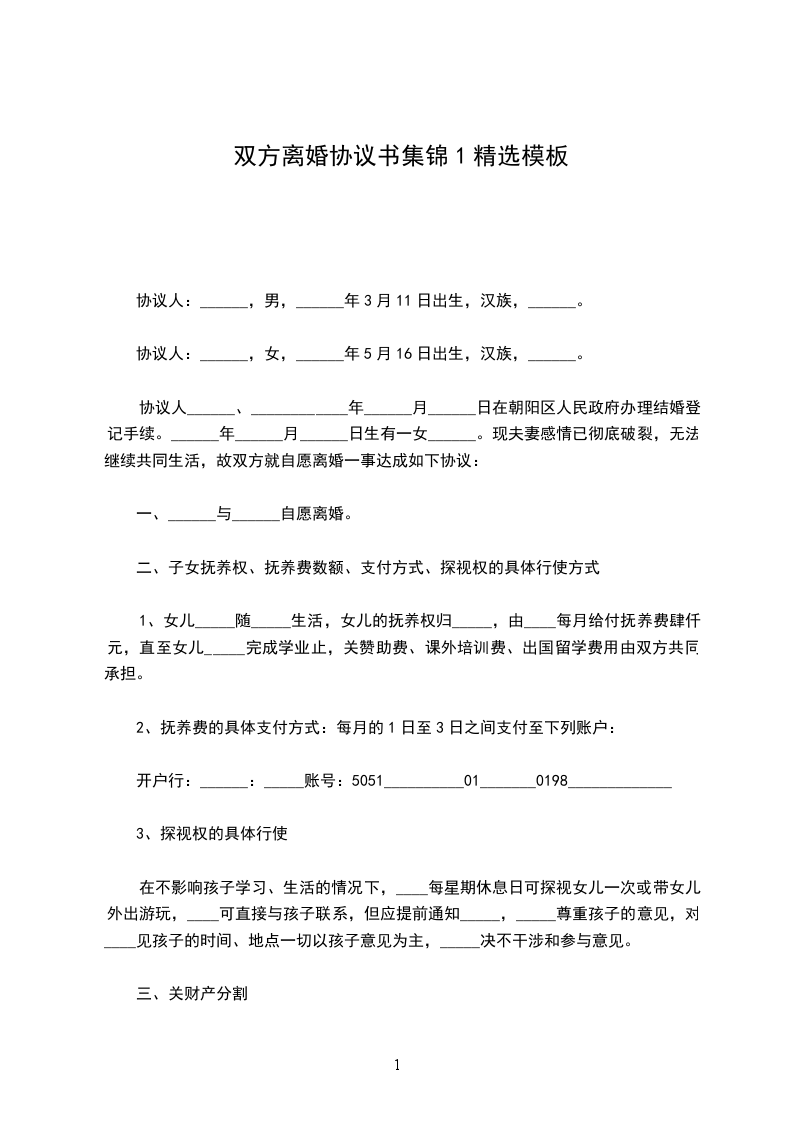 男女双方________年________月________日结婚,________年________月生一女孩王,现就离婚事议达成如下协议,供双方遵照执行: