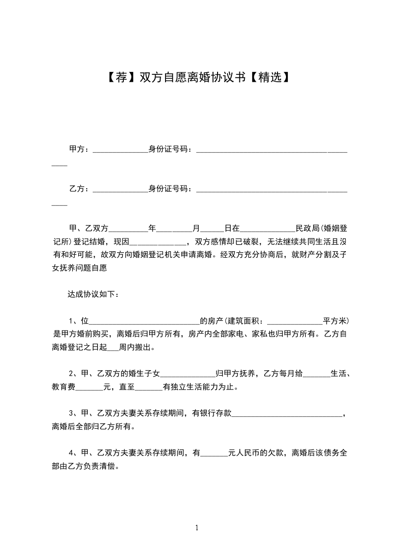 一、位_______的房产(建筑面积:____平方米)是甲方婚前购买,离婚后归甲方所有,房产内全部家电、家私也归甲方所有。乙方自离婚登记之日起一周内搬出。