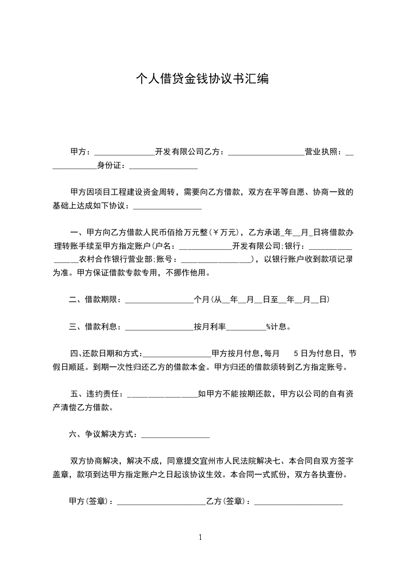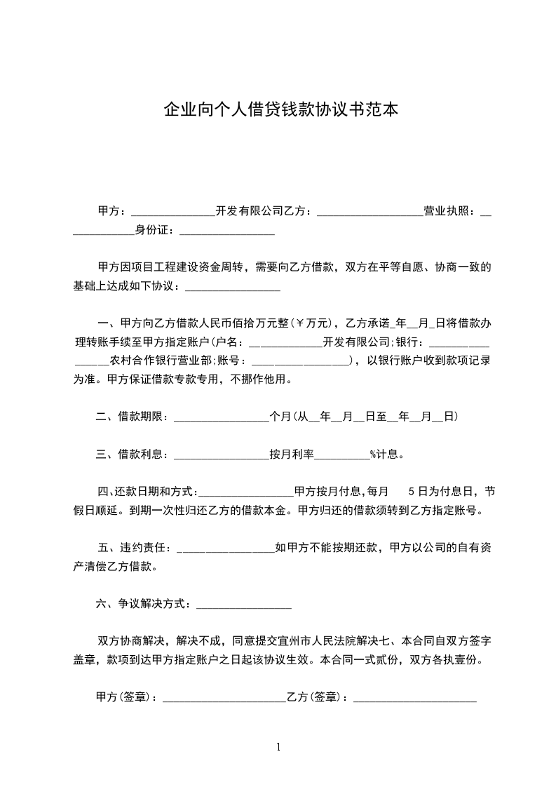 一、甲方向乙方借款人民币佰拾万元整(¥万元),乙方承诺_年__月_日将借款办理转账手续至甲方指定账户(户名:_____________开发有限公司;银行:_________________农村合作银行营业部;账号:_________________),以银行账户收到款项记录为准。甲方保证借款专款专用,不挪作他用。
