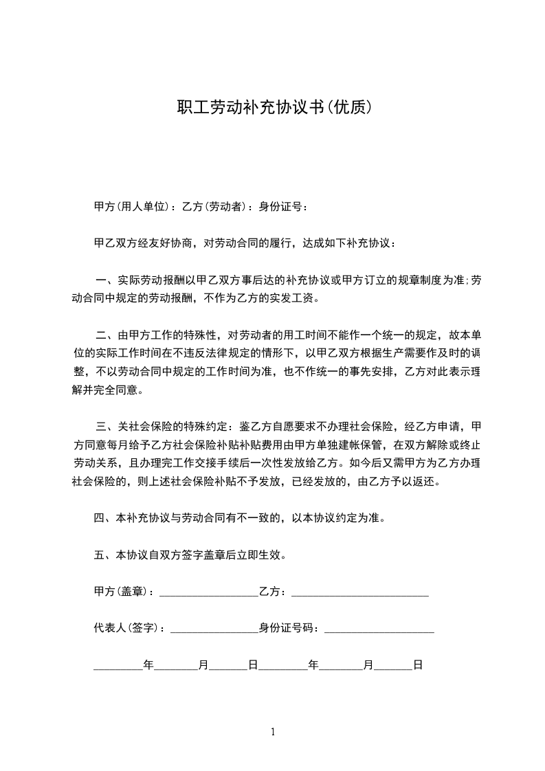 五、本补充协议作为劳动合同的,与《劳动合同》同时生效。