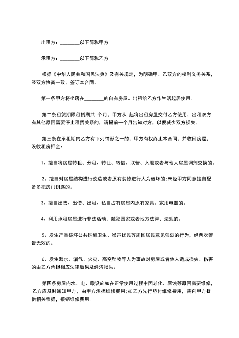 5、合同一经签订,双方都不得提前解除。租赁期内,如遇不可抗力因素导致无法继续履行本合同得,本合同自然终止,双方互不承担违约责任。