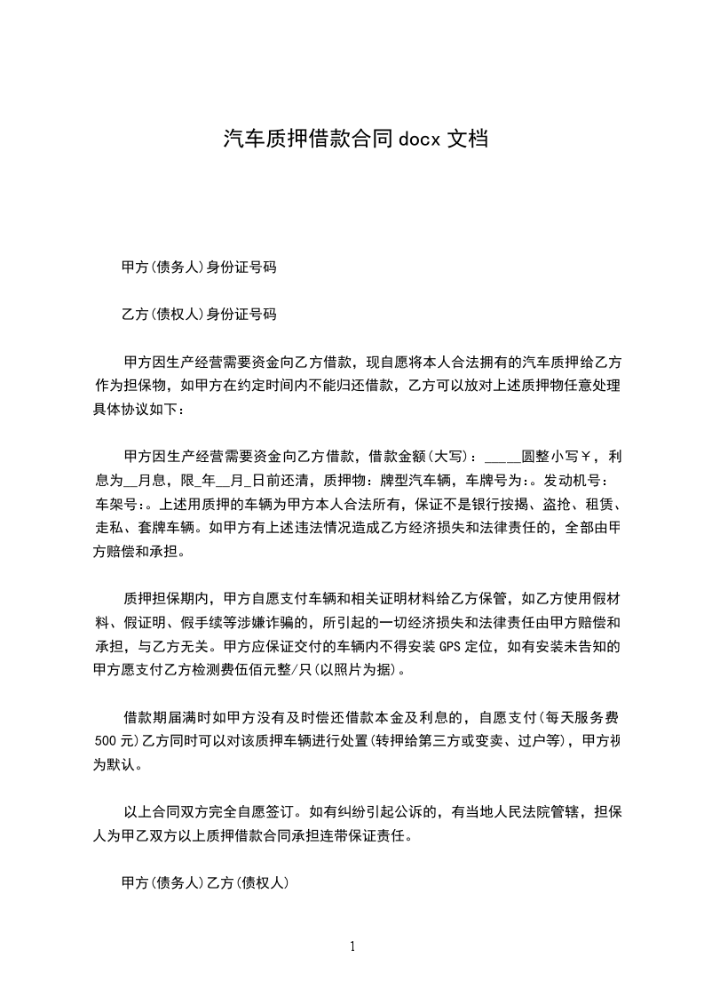 甲方因生产经营需要资金向乙方借款,借款金额(大写):_____圆整小写¥,利息为__月息,限_年__月_日前还清,质押物:牌型汽车辆,车牌号为:。发动机号:车架号:。上述用质押的车辆为甲方本人合法所有,保证不是银行按揭、盗抢、租赁、走私、套牌车辆。如甲方有上述违法情况造成乙方经济损失和法律责任的,全部由甲方赔偿和承担。