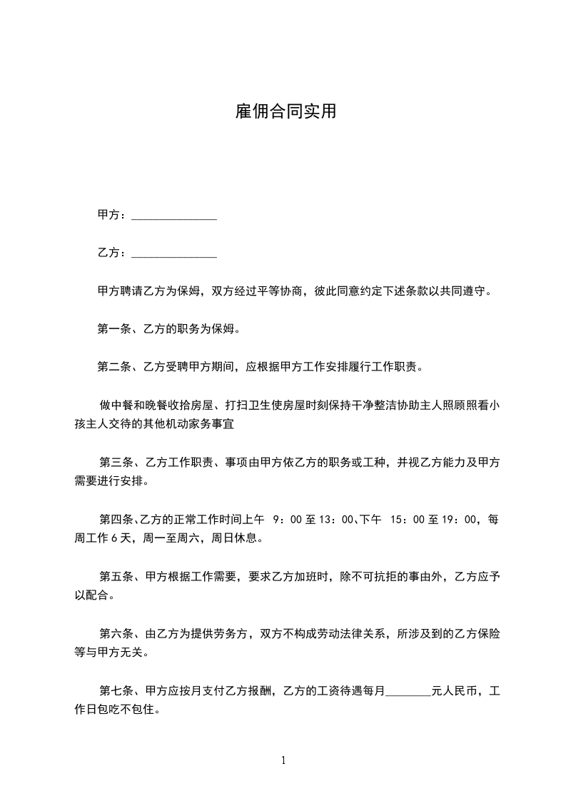 第一条、乙方的职务为保姆。