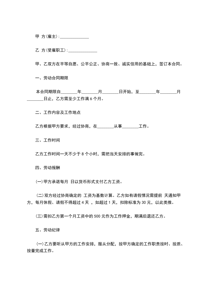 第七条、甲方应按月支付乙方报酬,乙方的工资待遇每月________元人民币,工作日包吃不包住。