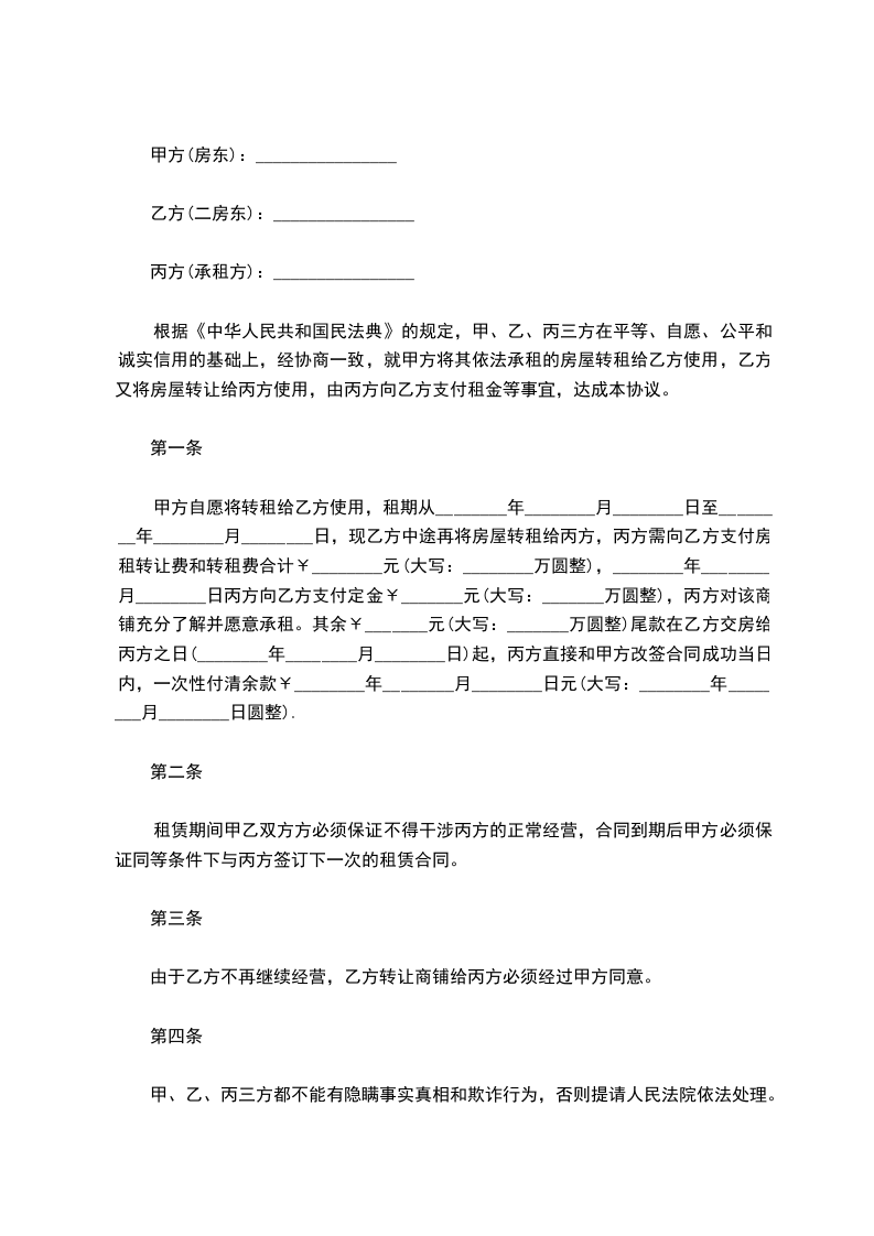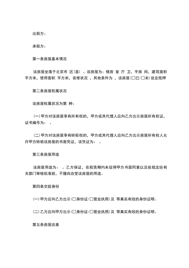 2、乙方租用上述房屋作______之用,未经甲方同意,乙方不得将房屋另作他用或转租。